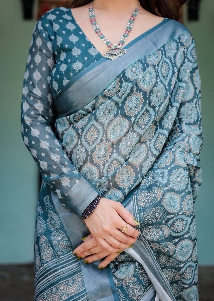 | NAME : | Presenting Pure Linen Saree With Tassels Deep Teal Blue With Intricate Paisley And Floral Prints Teal Blue Color DN 119 |