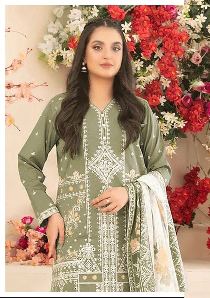 Pure Cambric Cotton With Embroidered Sequence And Multi Thread Work Pakistani Suit Pista Green Color DN 917