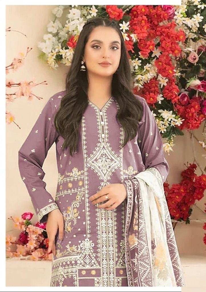 | NAME : | Pure Cambric Cotton With Embroidered Sequence And Multi Thread Work Pakistani Suit Purple Color DN 917 |