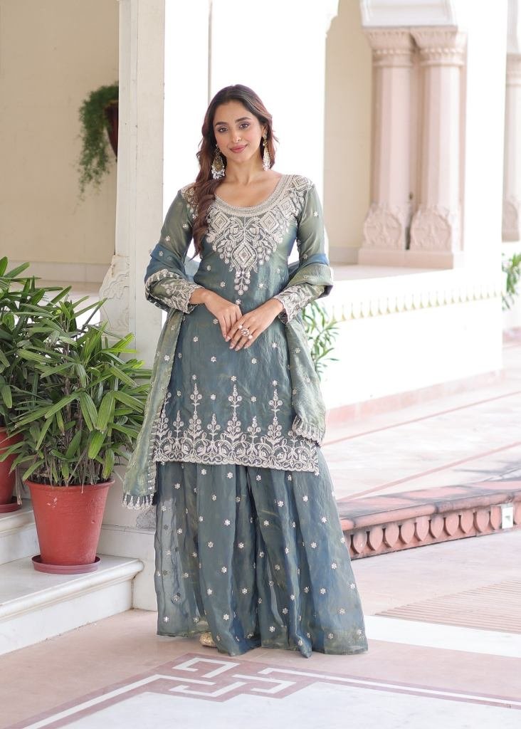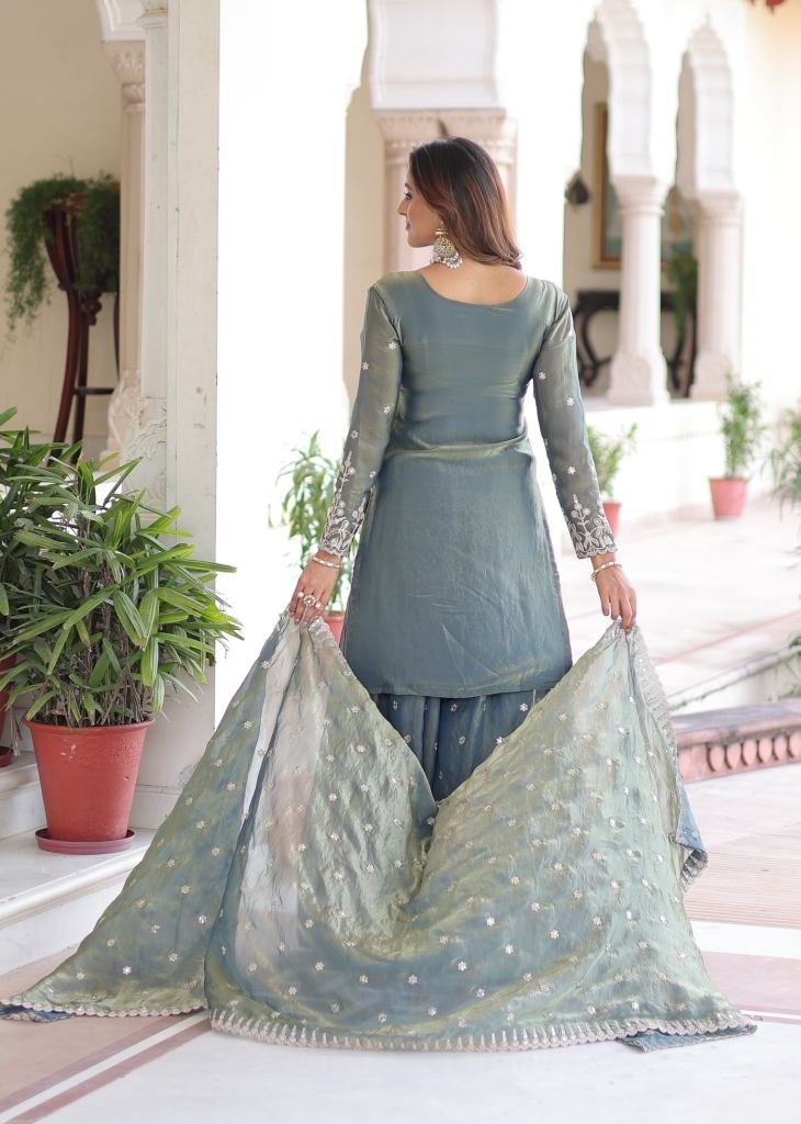 Readymade Sharara Suit Fendi Silk With Embroidery Coding Sequence Work Dusty Green Color DN 1211