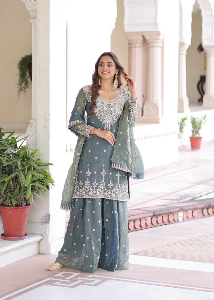 | NAME : | Readymade Sharara Suit Fendi Silk With Embroidery Coding Sequence Work Dusty Green Color DN 1211 |