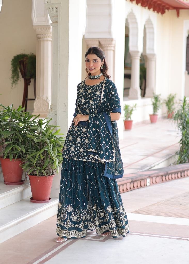 Readymade Sharara Suit With Embroidery Sequence Work Teal Blue Color DN 1210