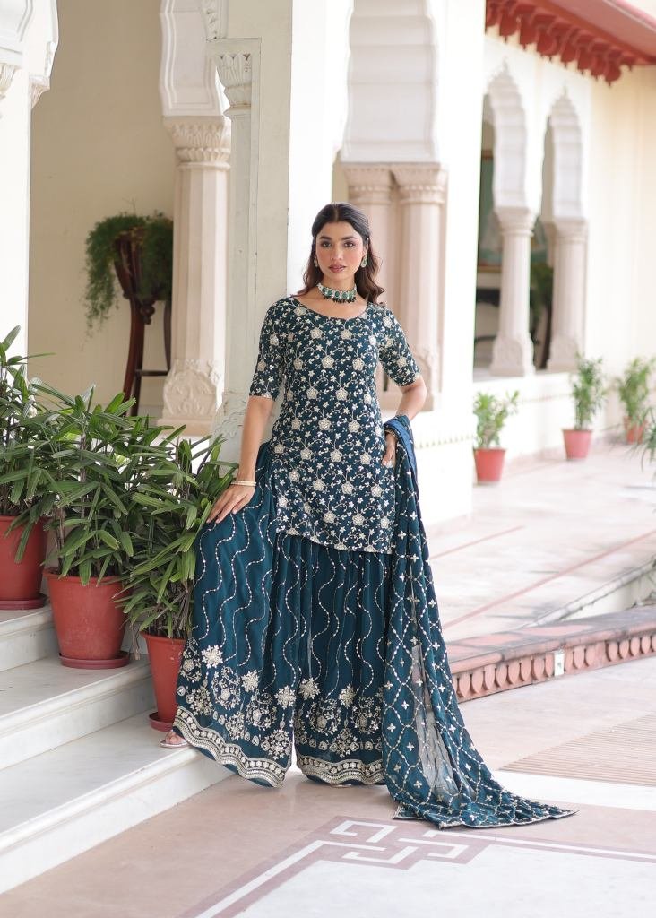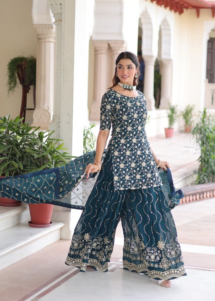 | NAME : | Readymade Sharara Suit With Embroidery Sequence Work Teal Blue Color DN 1210 |