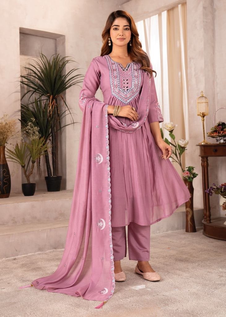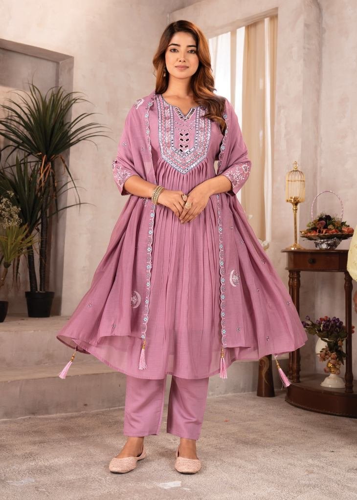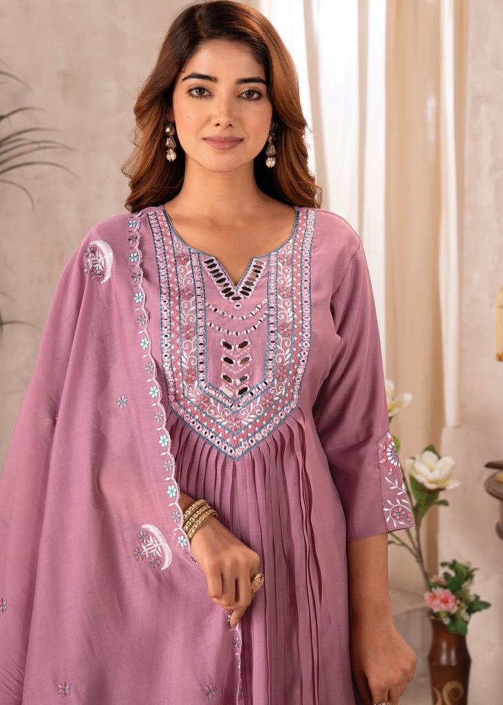 Riyazat Premium Mal Chanderi Heavy Embroidery And Real Mirror Work 3 Piece Kurta Set Mauve Color