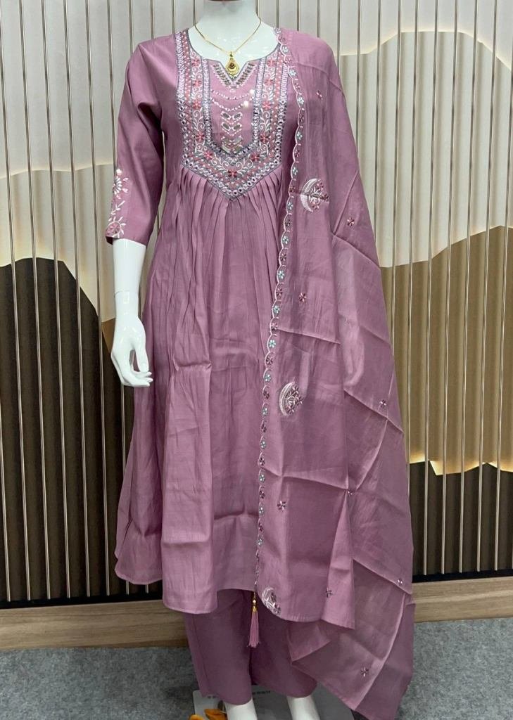 | NAME : | Riyazat Premium Mal Chanderi Heavy Embroidery And Real Mirror Work 3 Piece Kurta Set Mauve Color |
