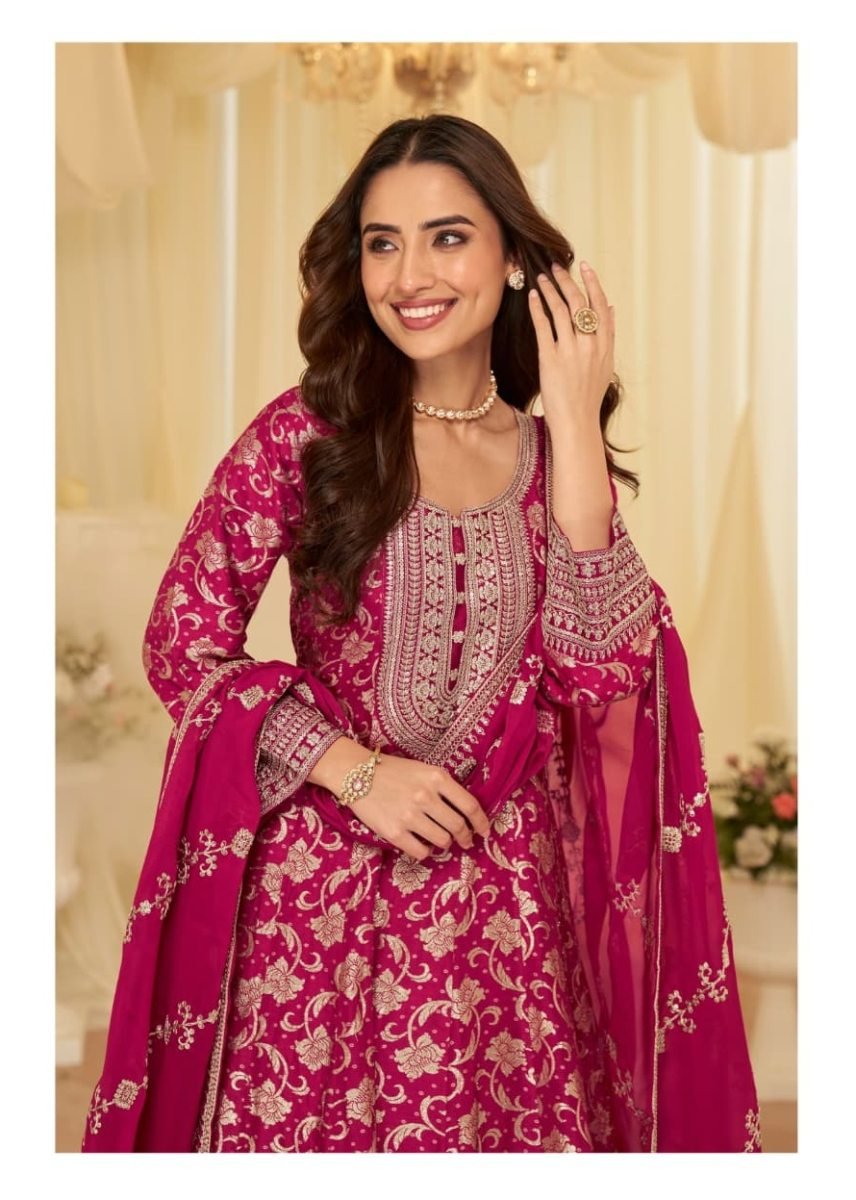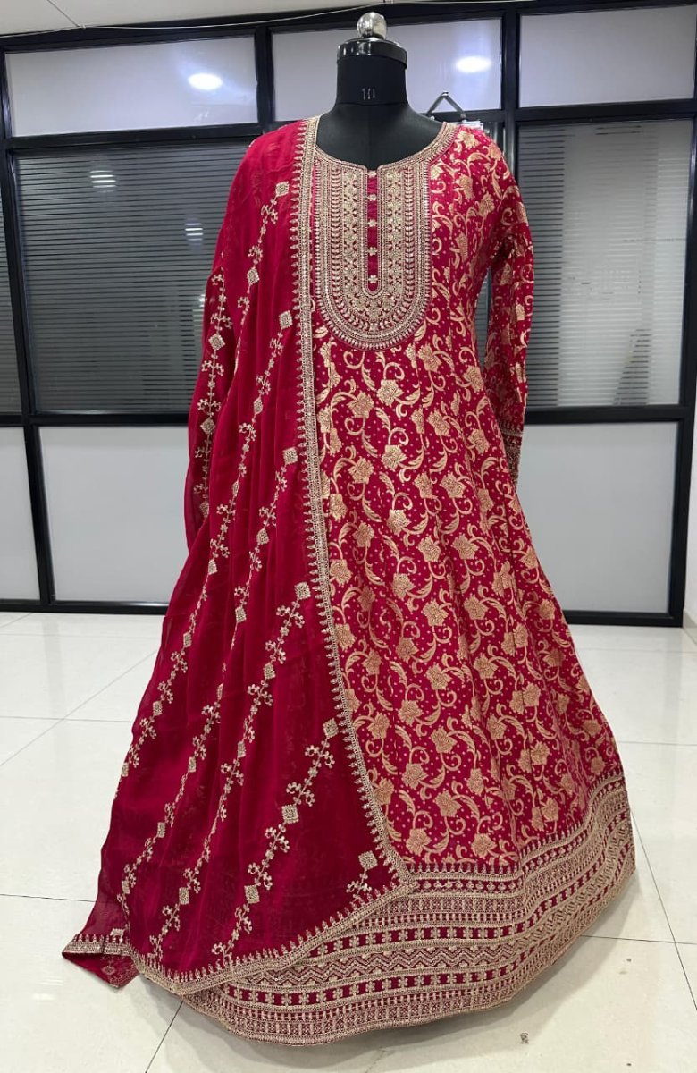 | NAME : | Sayuri Designer Aaradhana DN 10238 Heavy Pure Viscose Jacquard Silk With Embroidery Sequence Work Anarkali Gown Rani Pink Color |