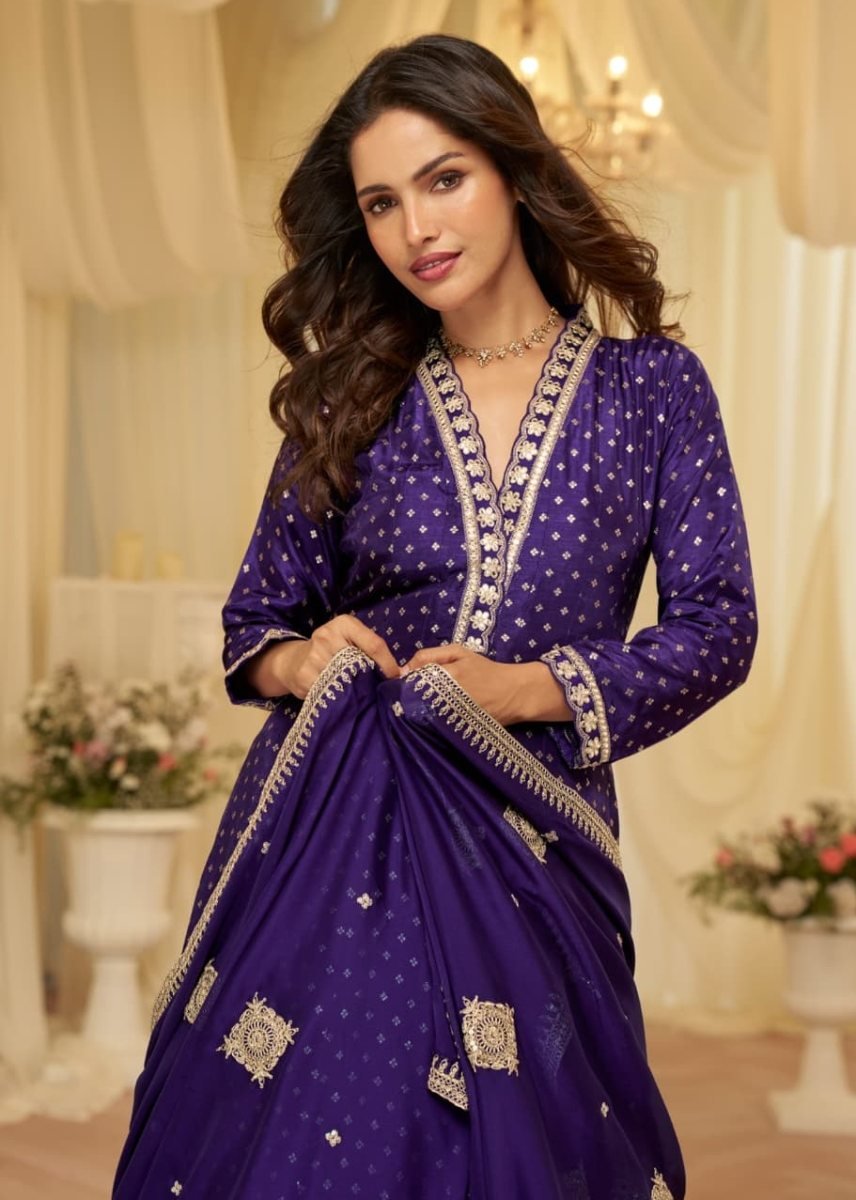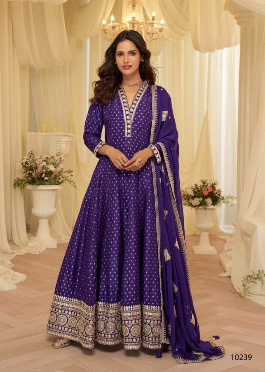 | NAME : | Sayuri Designer Aaradhana DN 10239 Heavy Pure Viscose Jacquard Silk With Embroidery Sequence Work Anarkali Gown Purple Color |