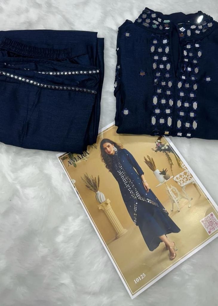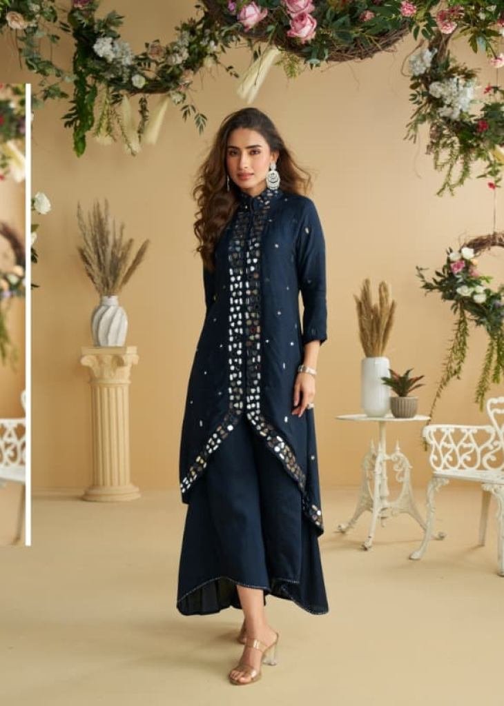 | NAME : | Sayuri Designer Amara Premium Silk Top Palazzo Set With Embellished Mirror Work Navy Blue Color DN 10125 |
