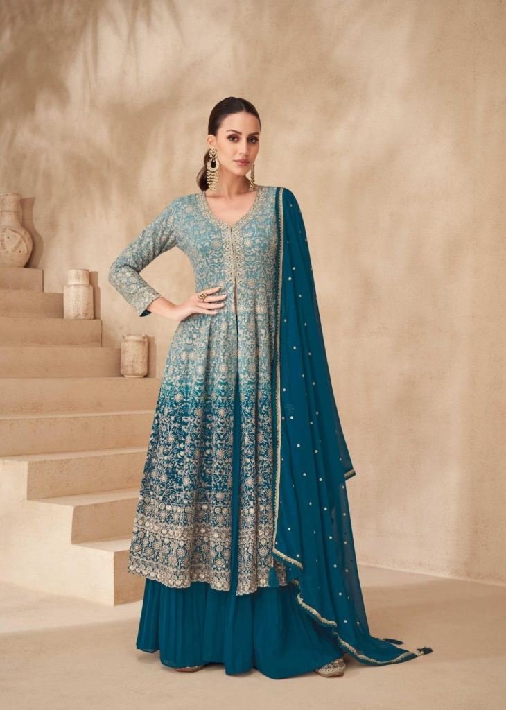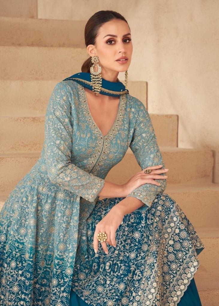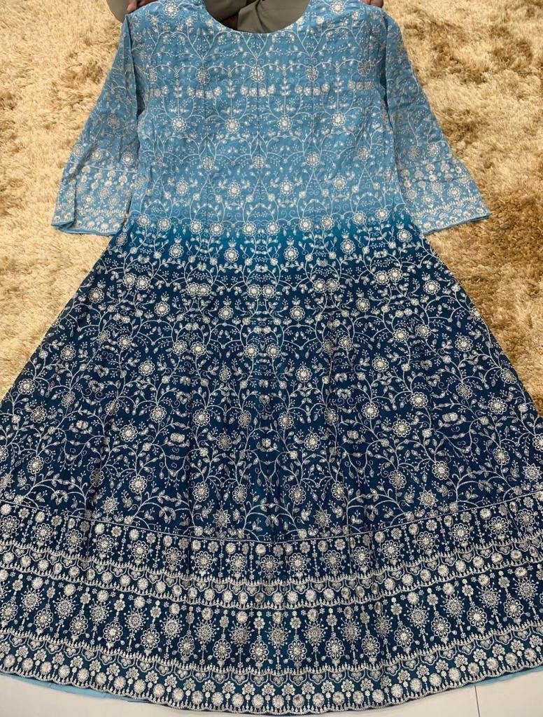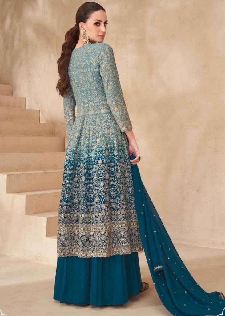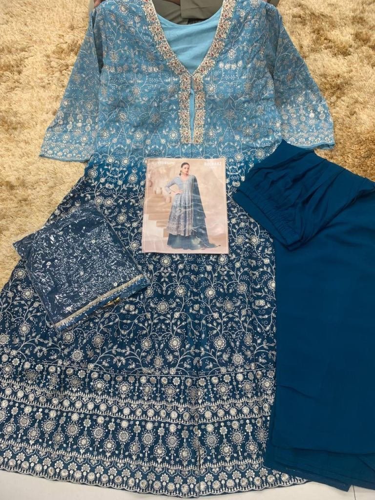 Sayuri Designer Gulnaaz Anarkali Suit In Real Georgette With Embroidery Sequence And Thread Zari Detailing Teal Blue Color DN 10207
