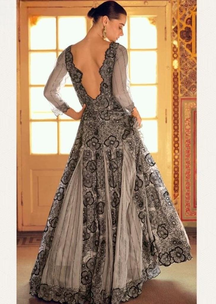 Sayuri Designer Karishma Anarkali Gown Viscose Simar Jacquard Silk Festive Stylist Front And Back Embroidered Grey Color DN 5768