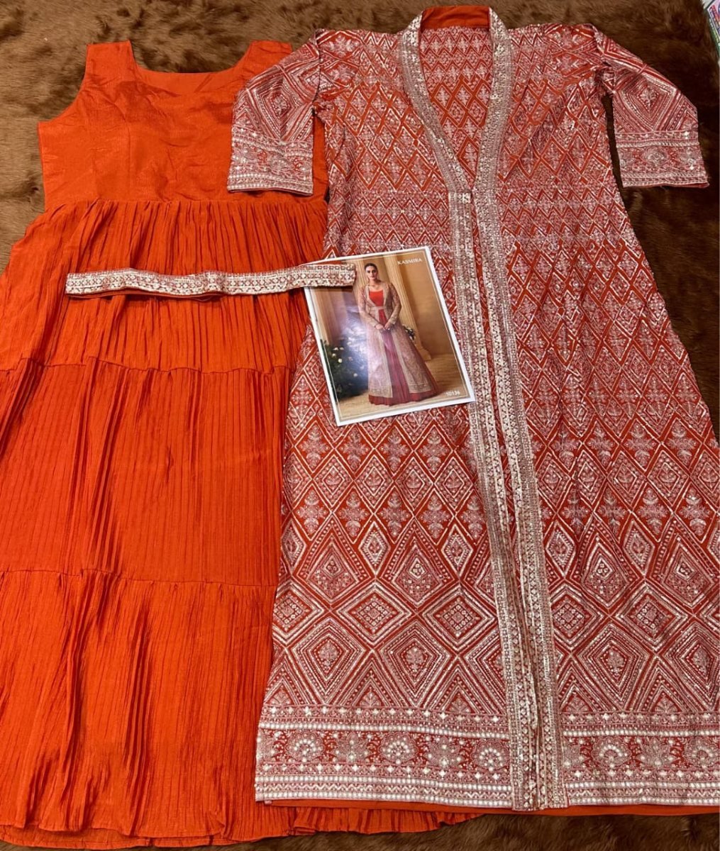 | NAME : | Sayuri Designer Kasmira DN 10136 Heavy Chinon With Embroidery Sequence Work Anarkali Gown With Shrug Orange Color |