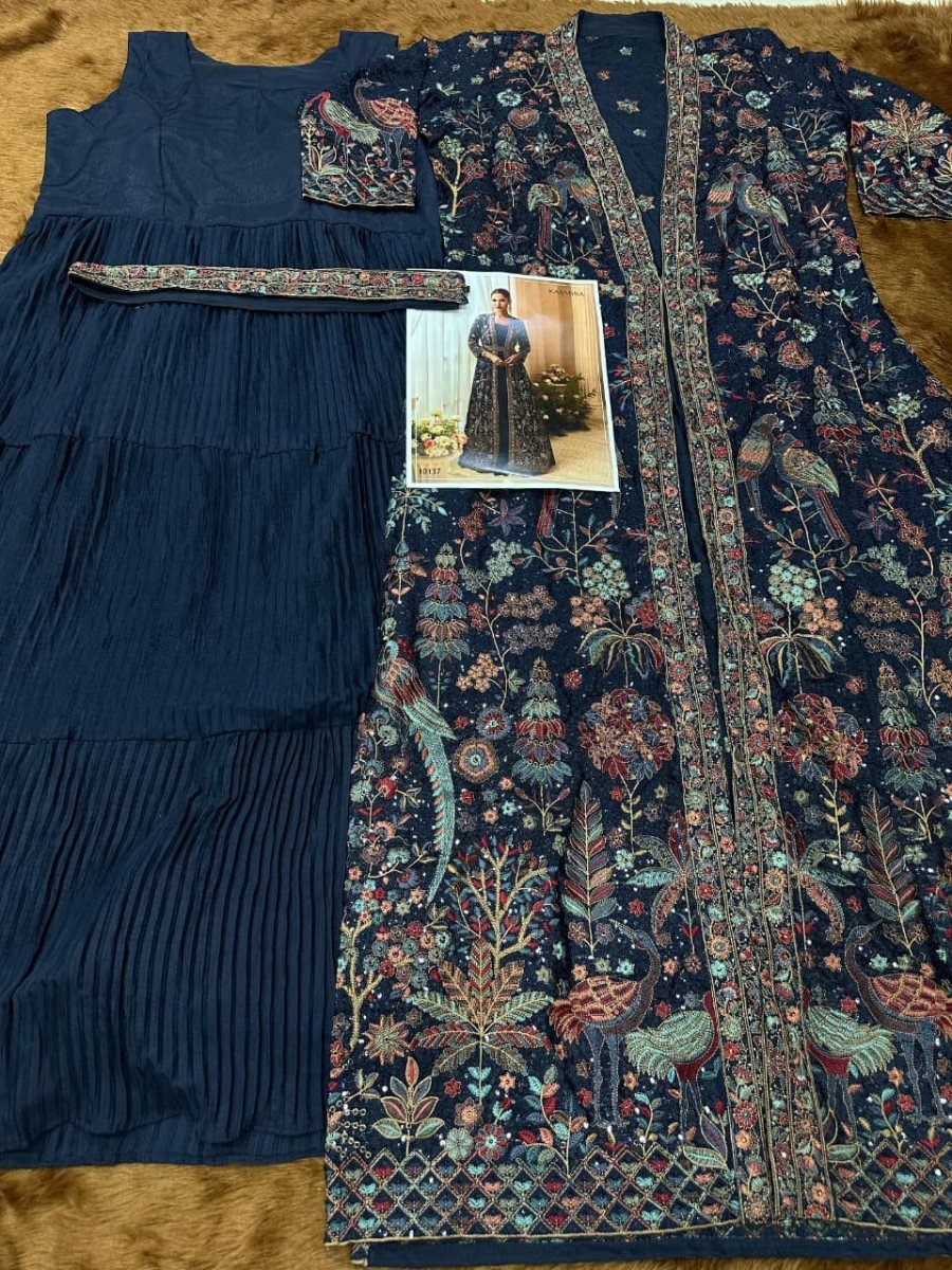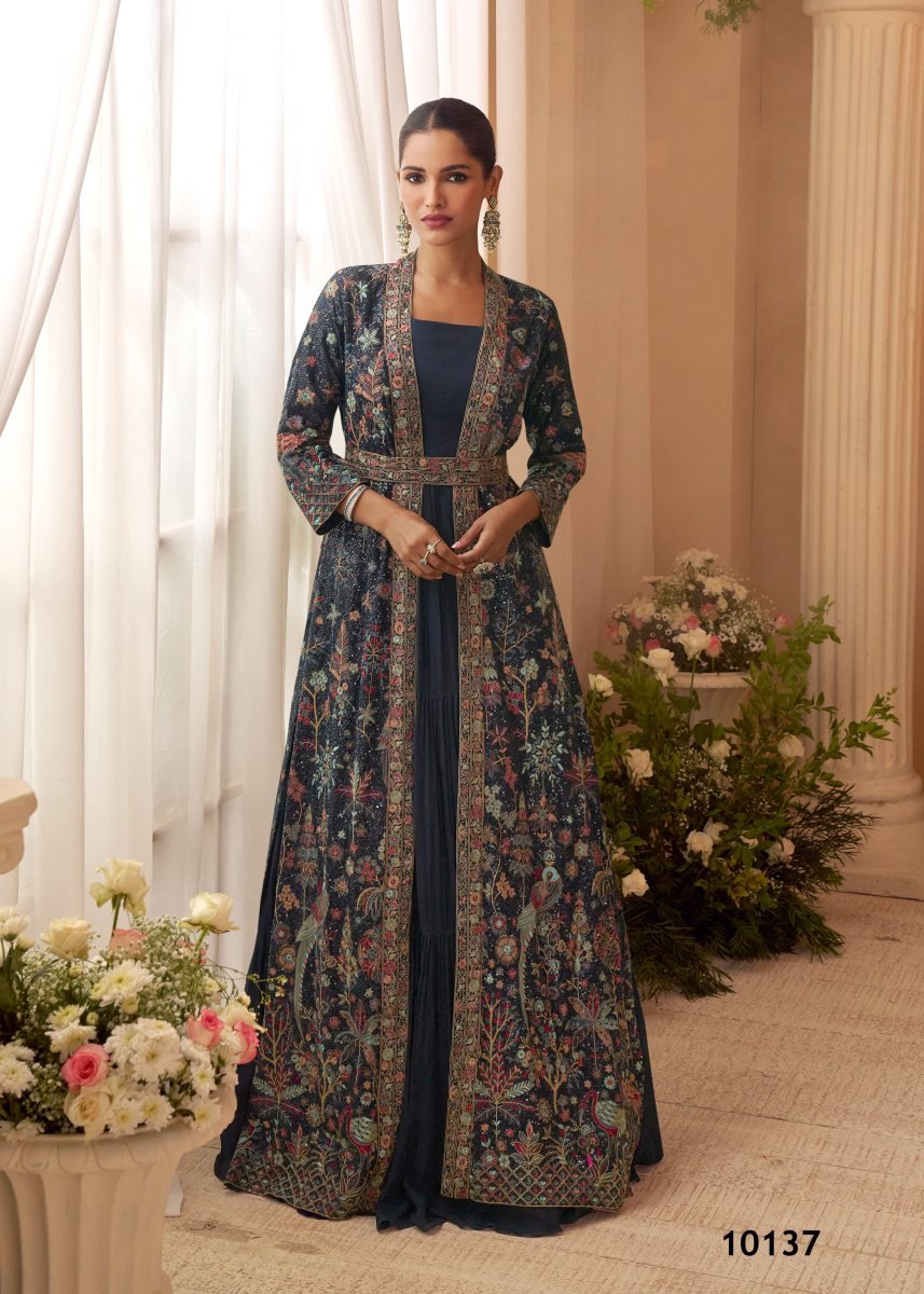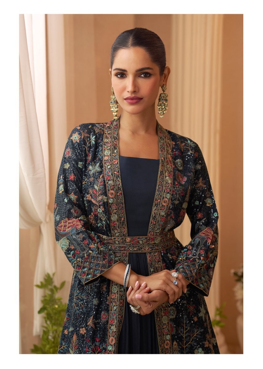 | NAME : | Sayuri Designer Kasmira DN 10137 Heavy Chinon With Embroidery Sequence Work Anarkali Gown With Shrug Nevy Blue Color |