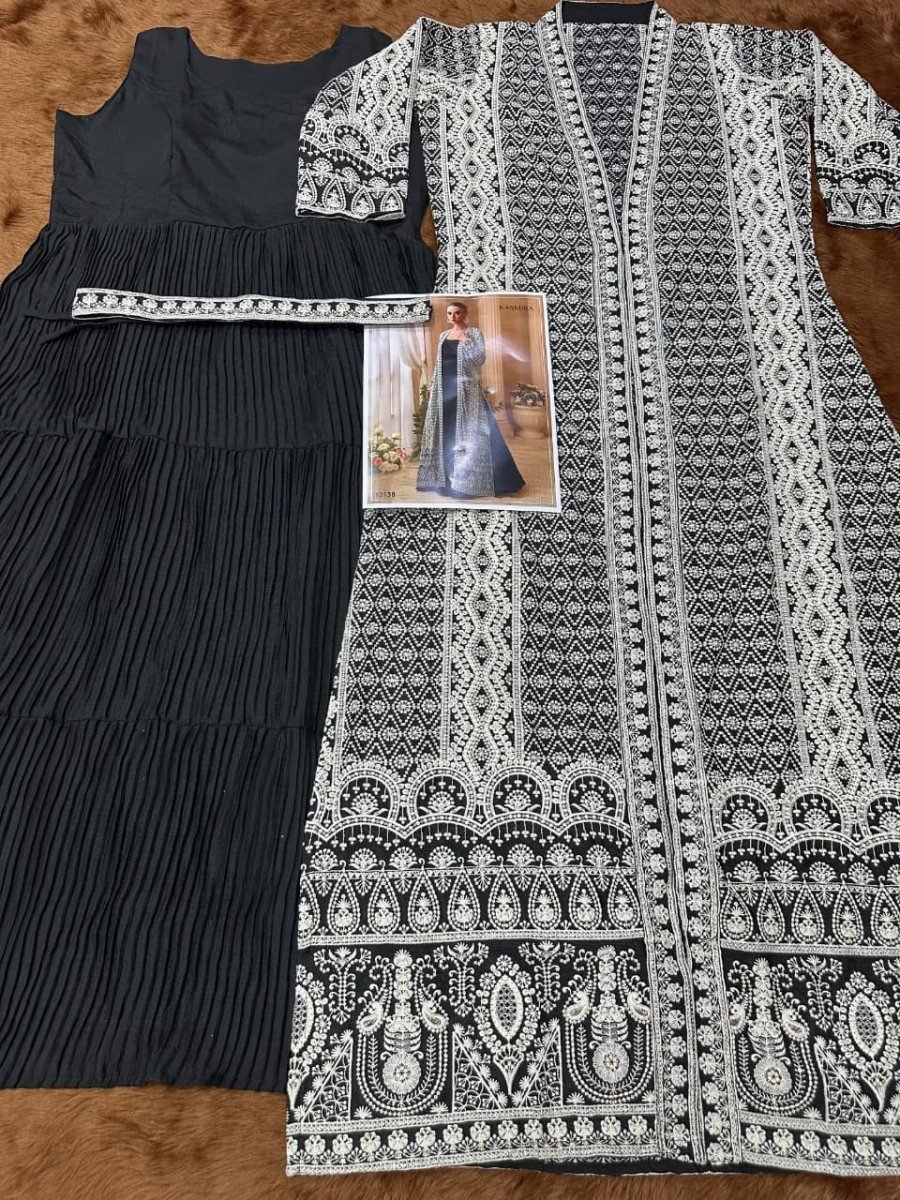 | NAME : | Sayuri Designer Kasmira DN 10138 Heavy Chinon With Embroidery Sequence Work Anarkali Gown With Shrug Black Color |