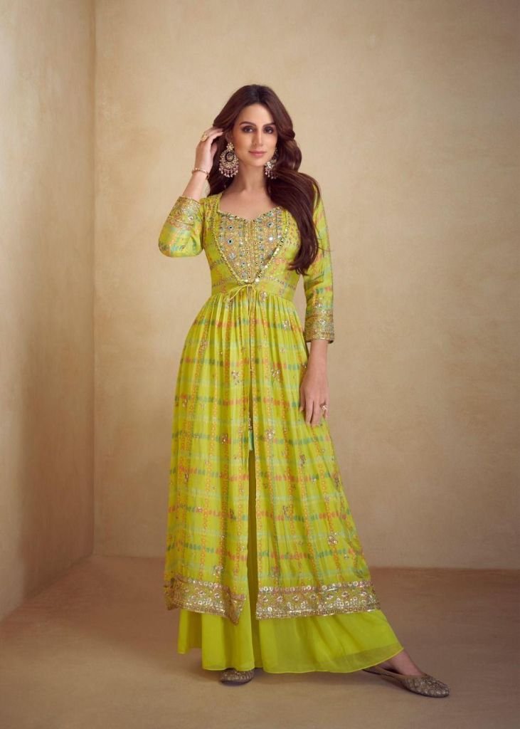 | NAME : | Sayuri Designer Kiera Crop Tops Real Chinon Silk Digital Print With Embroidery And Handwork Lime Yellow Color DN 7521 |