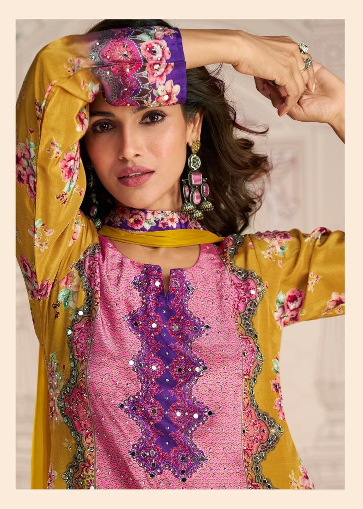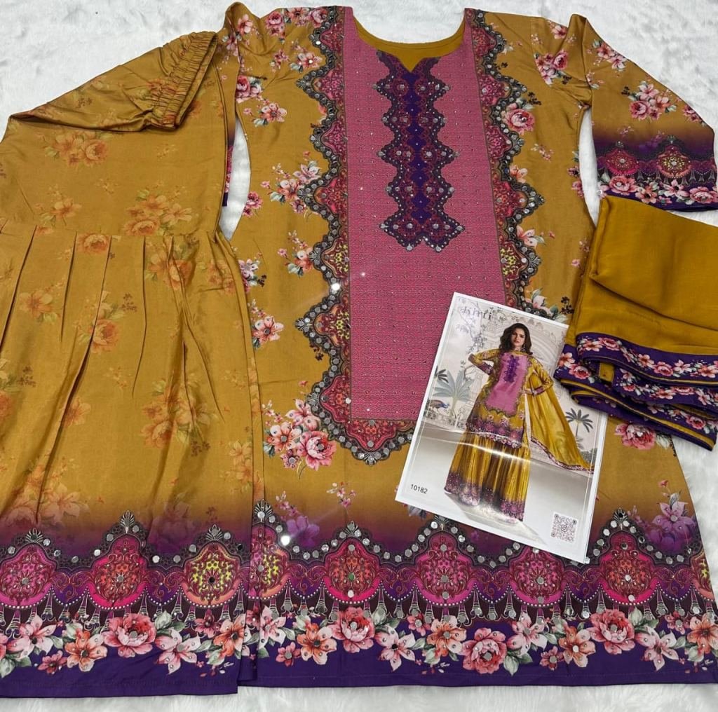 | NAME : | Sayuri Designer Kirti Premium Crepe Sharara Suit With Digital Print And Hand Mirror Work Yellow Color DN 10182 |