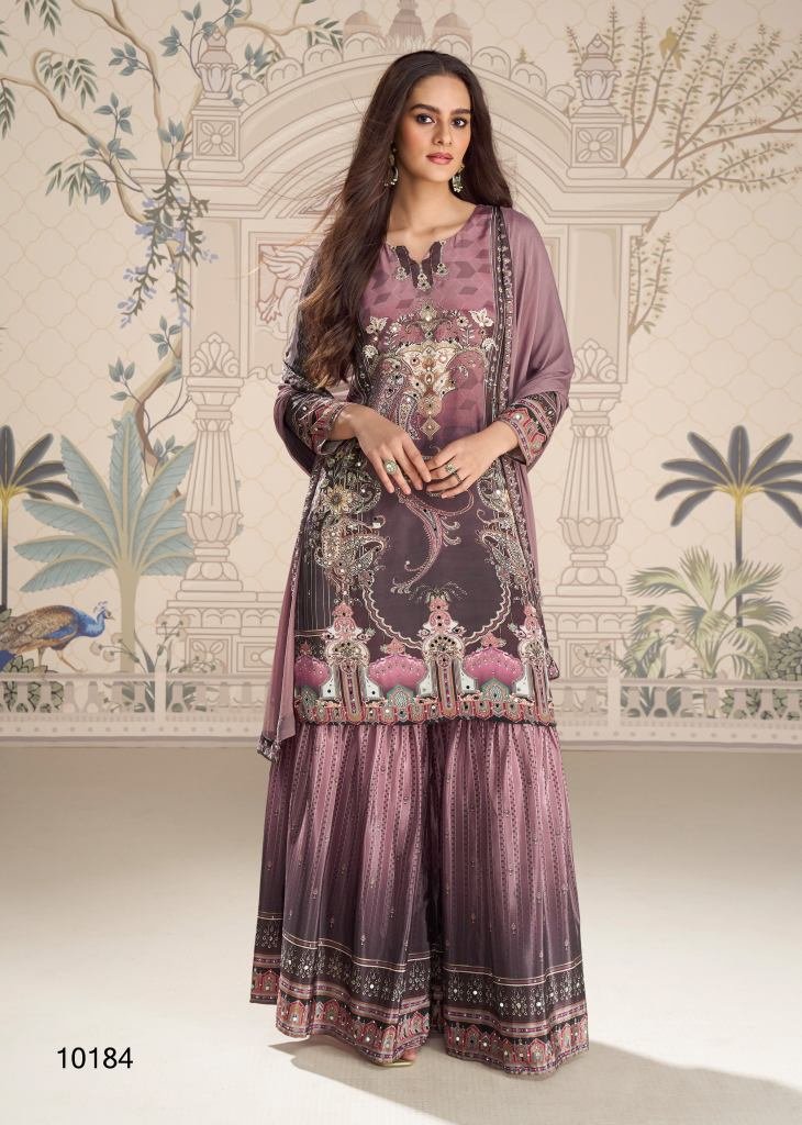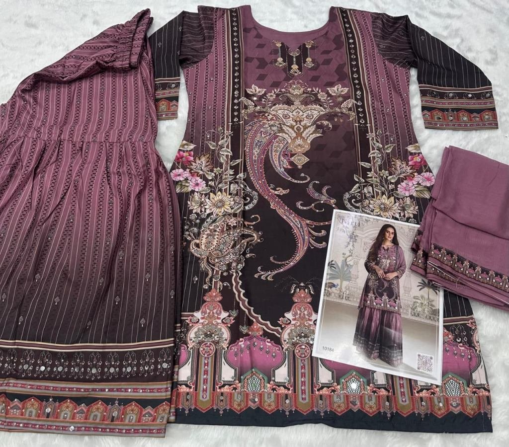 | NAME : | Sayuri Designer Kirti Premium Crepe Sharara Suit With Digital Print And Hand Mirror Work Dusty Purple Color DN 10184 |