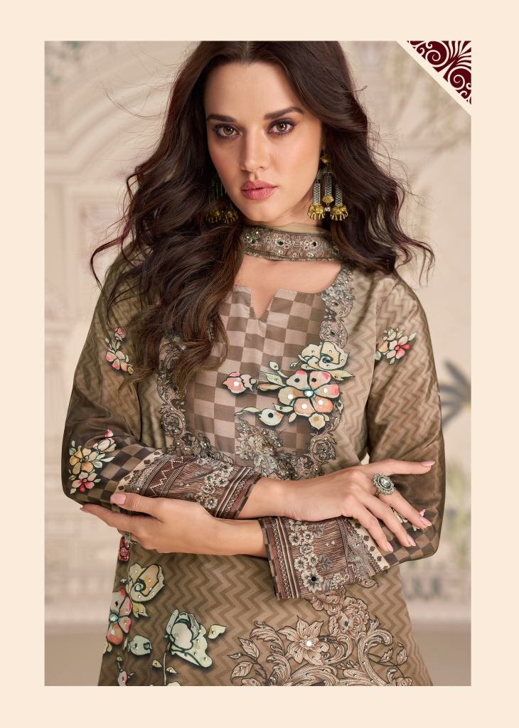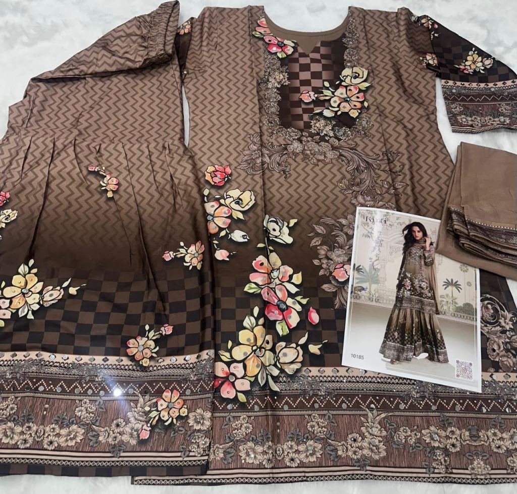 | NAME : | Sayuri Designer Kirti Premium Crepe Sharara Suit With Digital Print And Hand Mirror Work Coffee Brown Color DN 10185 |