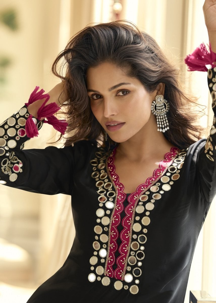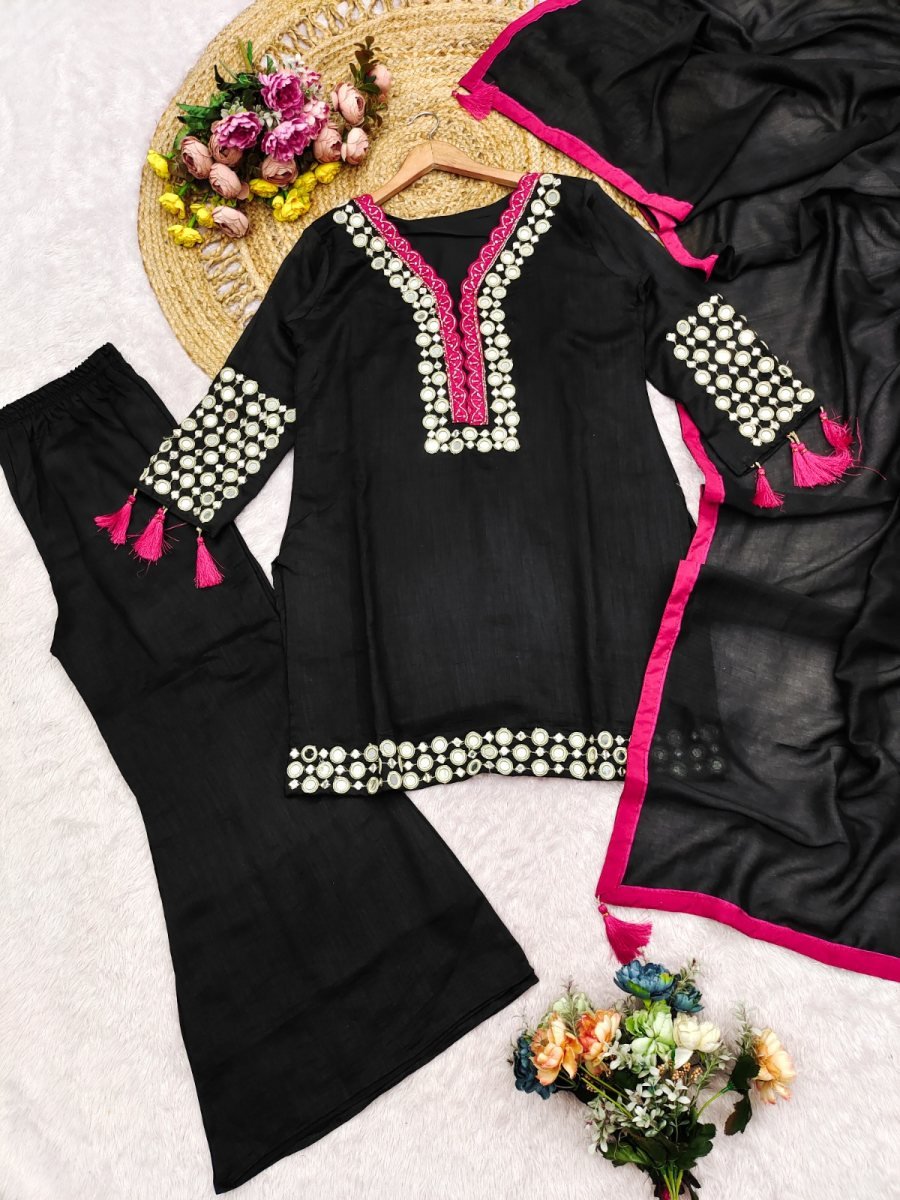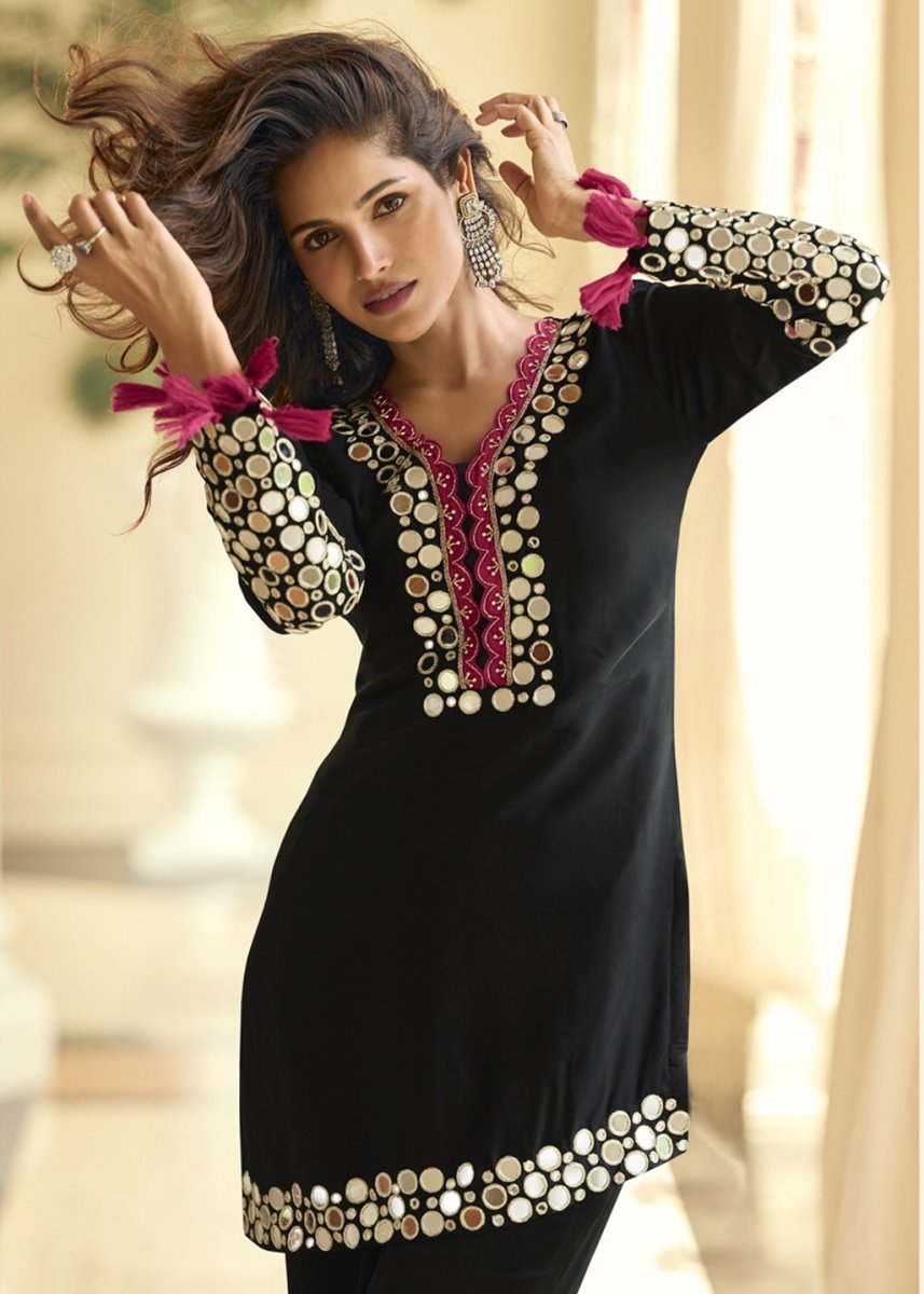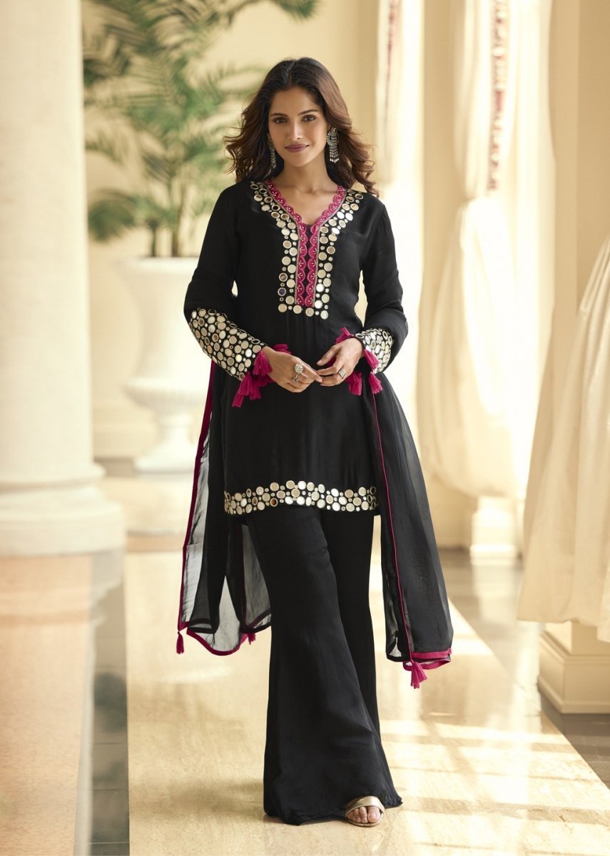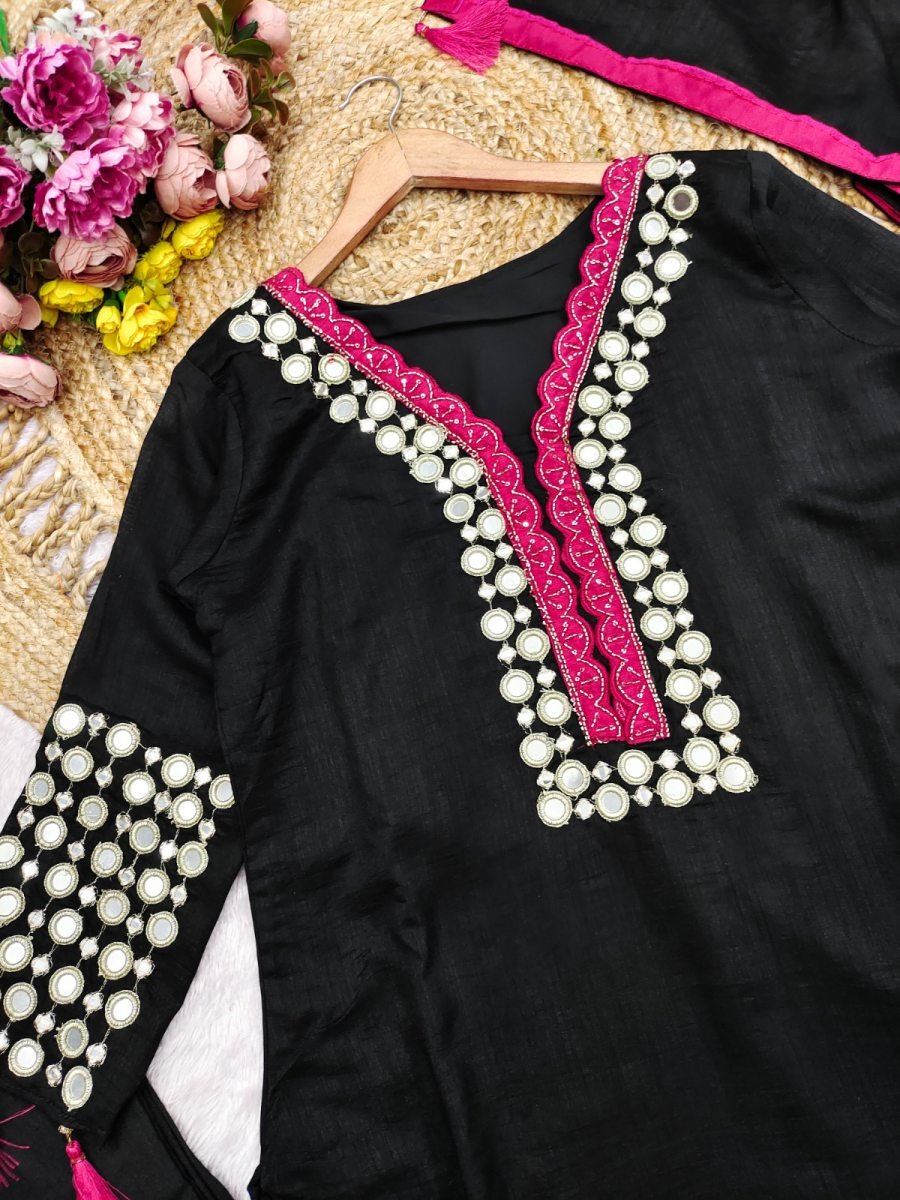 | NAME : | Sayuri Designer Mirror DN 10268 Vichitra Silk With Real Mirror Hand Work Readymade Suit Black Color |