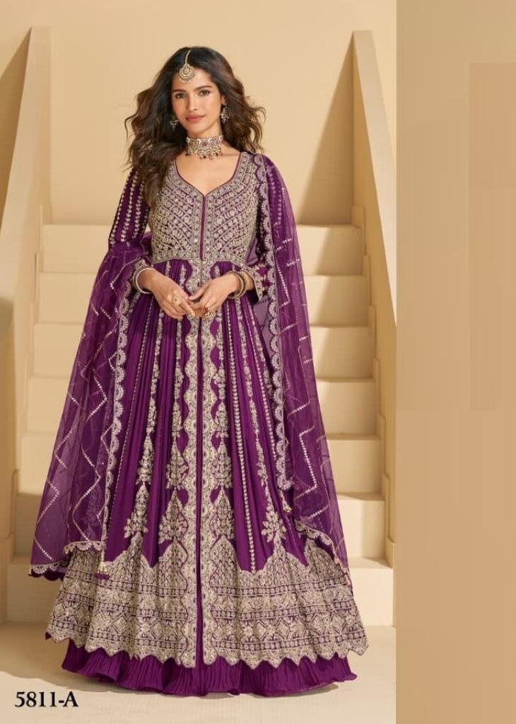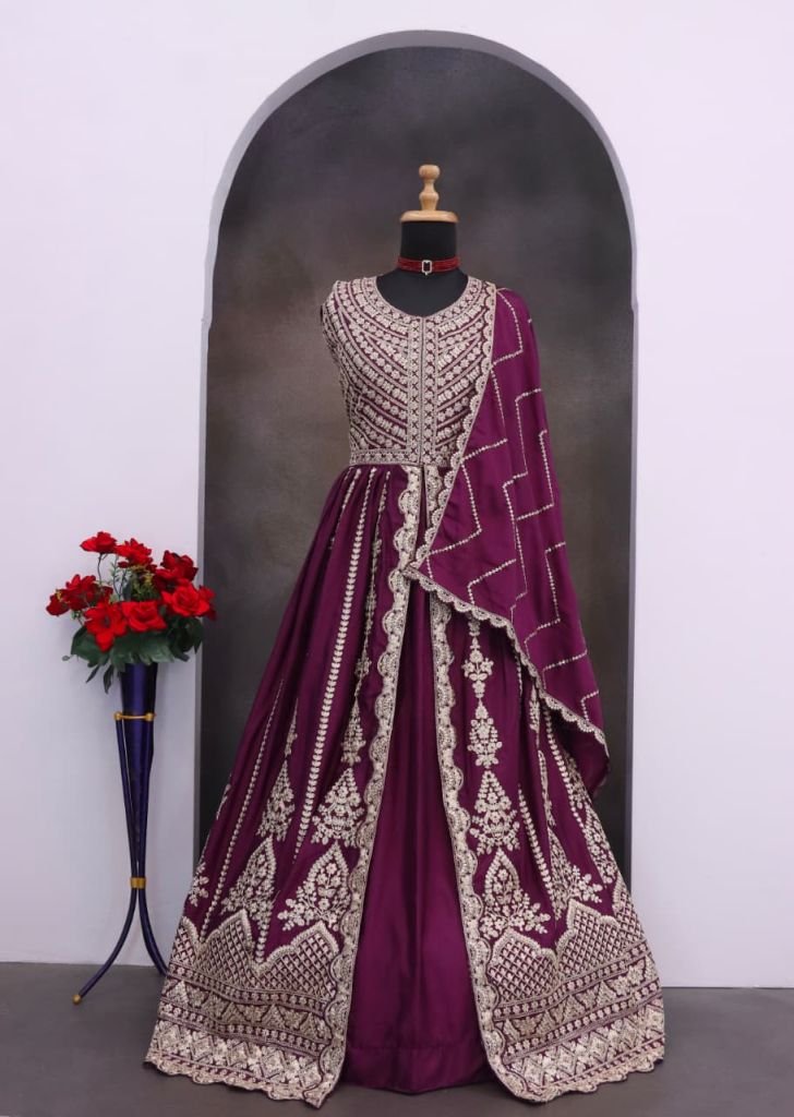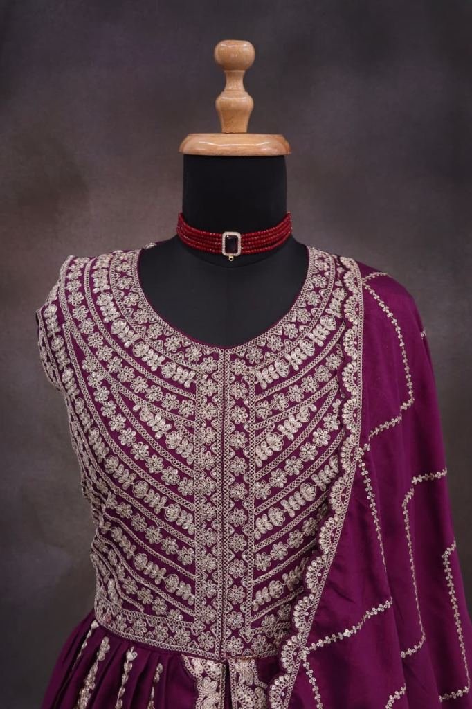 | NAME : | Sayuri Designer Mirza Anarkali Gown In Heavy Chinon Fabric With Embroidery Purple Wine DN 5811 |