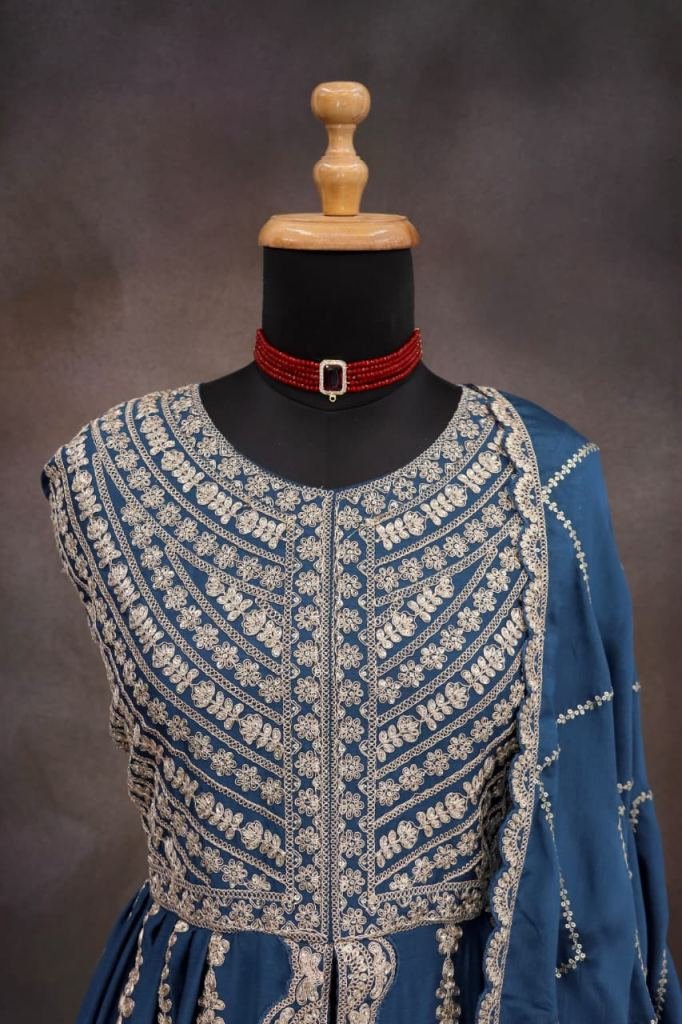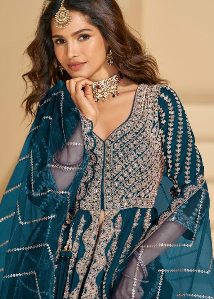 | NAME : | Sayuri Designer Mirza Anarkali Gown In Heavy Chinon Fabric With Embroidery Teal Blue DN 5811 |