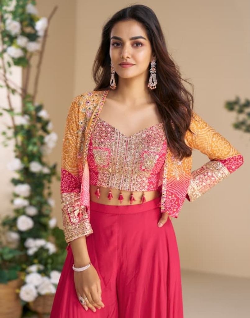 | NAME : | Sayuri Designer Moon Heavy Chinon Silk Premium 3 Piece Indo Western Pink Color DN 10049 |