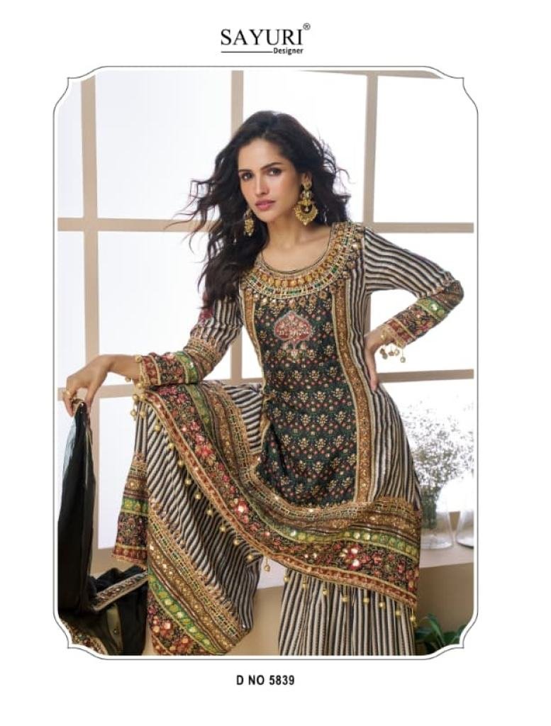 | NAME : | Sayuri Designer Pakeeza With Heavy Crepe Silk With Multi Digital Print With Aari Work Work Sharara Suit Black Color DN 5839 |