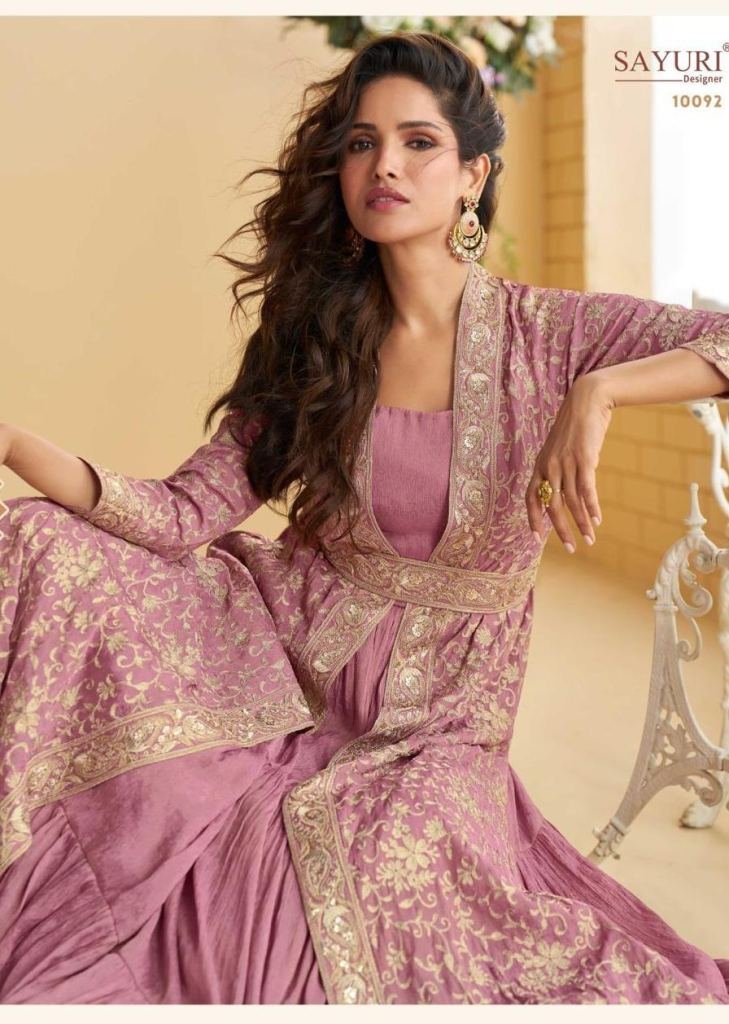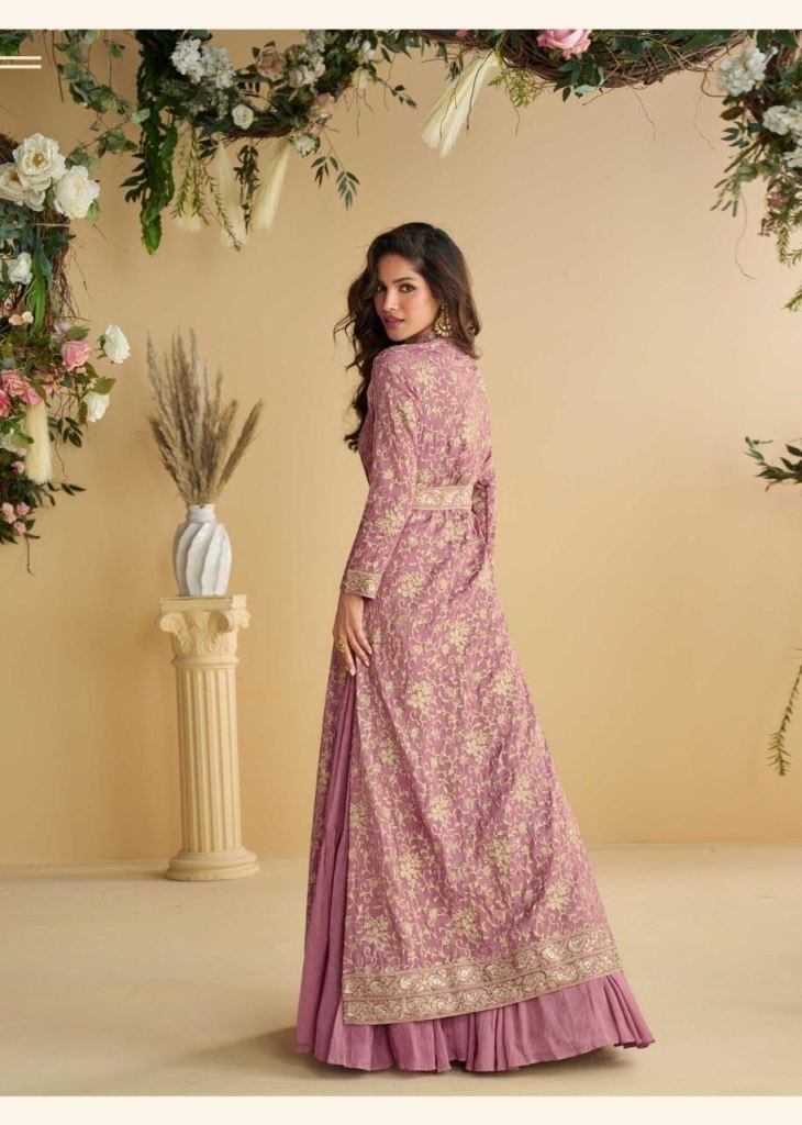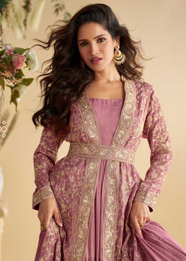 Sayuri Designer Tulip Anarkali Gown Shrug With Belt Real Premium Chinon Silk With Embroidery Work Mauve Color DN 10092