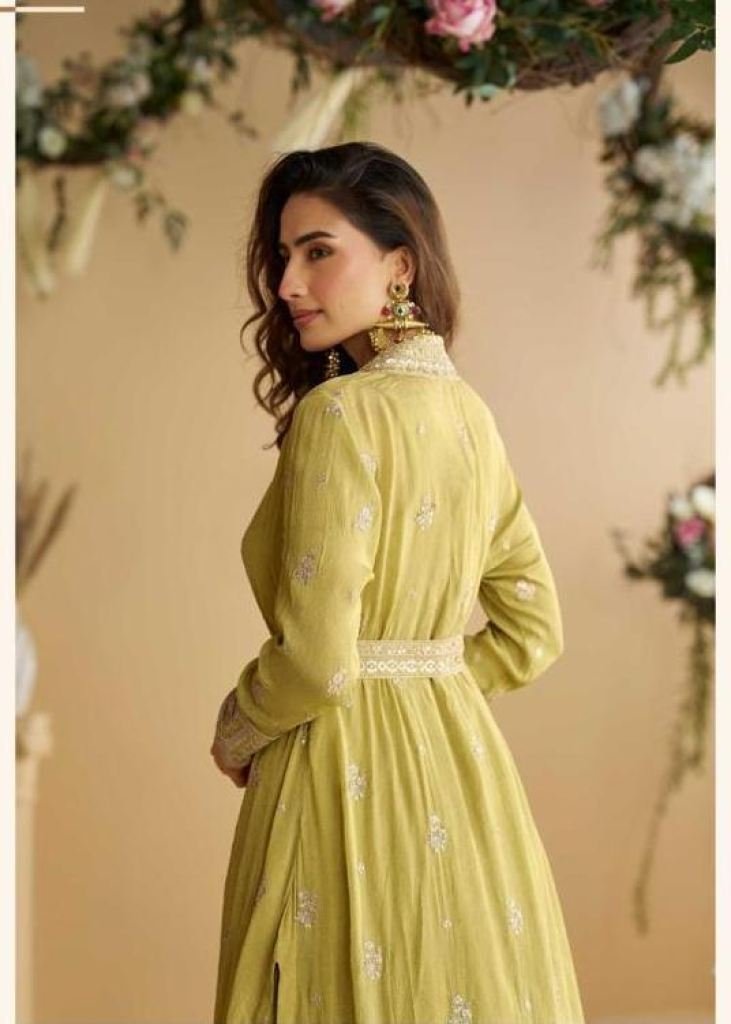 | NAME : | Sayuri Designer Tulip Anarkali Gown Shrug With Belt Real Premium Chinon Silk With Embroidery Work Olive Green Color DN 10093 |