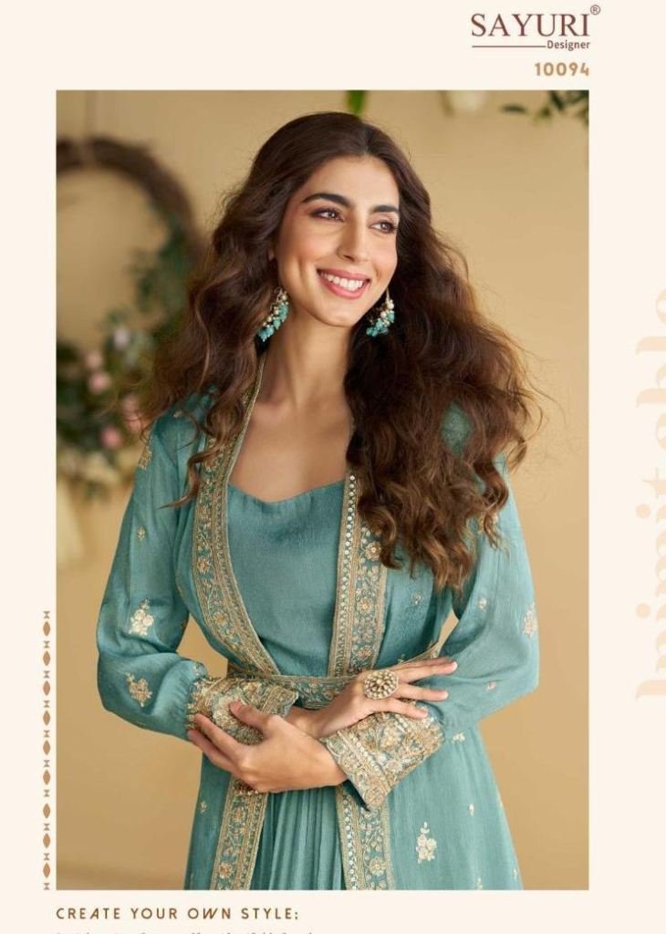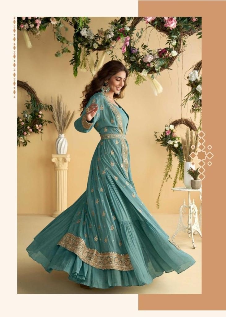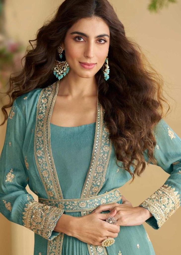 Sayuri Designer Tulip Anarkali Gown Shrug With Belt Real Premium Chinon Silk With Embroidery Work Blue Color DN 10094