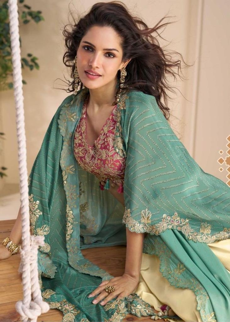 | NAME : | Sayuri Designer Wonaya Western Style Blouse Palazzo Dupptta Heavy Chinon Silk With Embroidery sequence work Sea Green Color DN 10050 |
