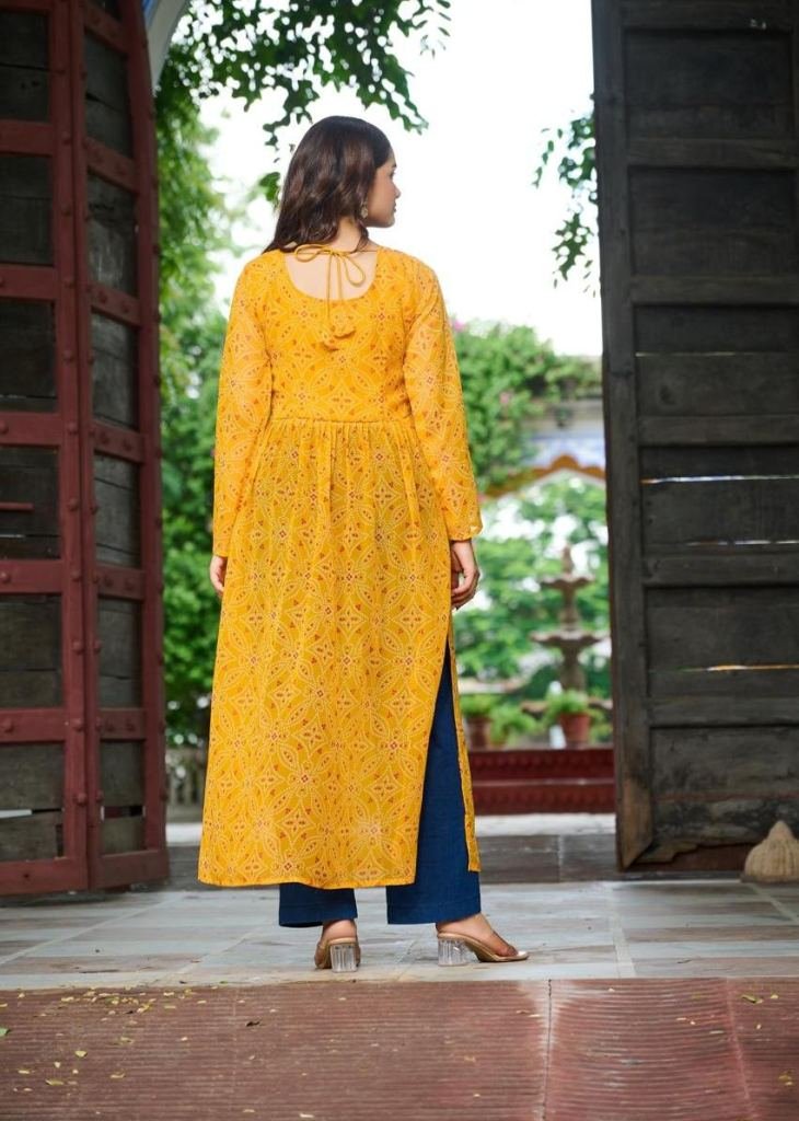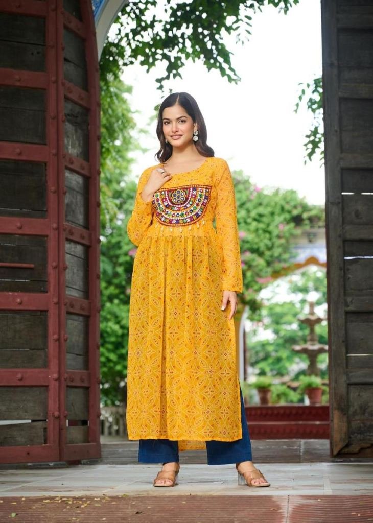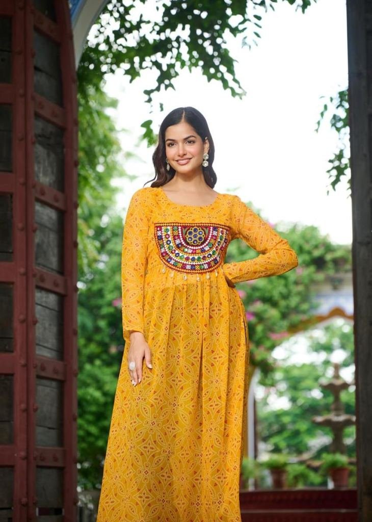 NAME : | Special Navratri Collection Faux Georgette And Bandhej Print With kutch Patch Work Kurti Yellow Color |