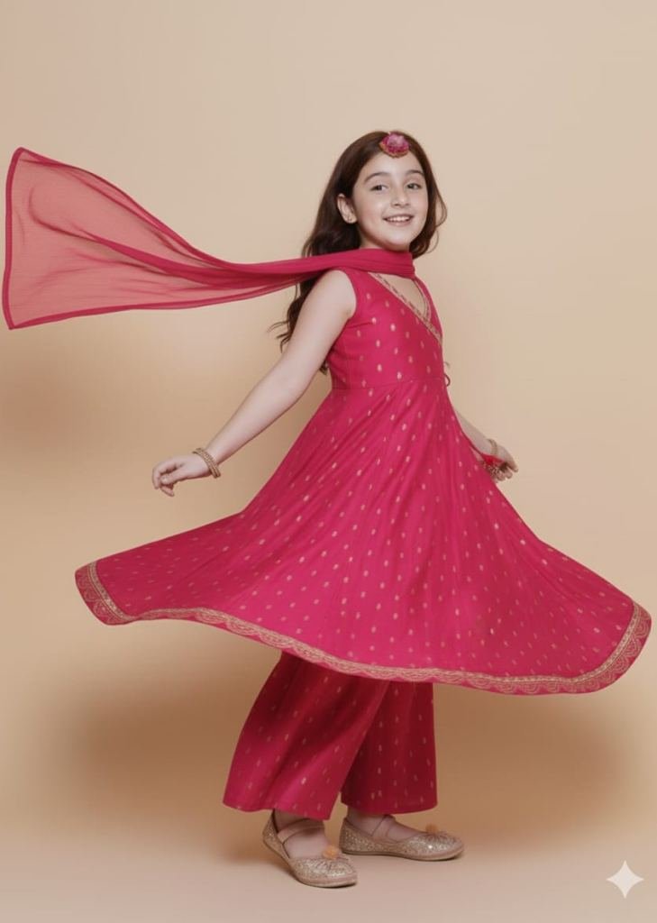 | NAME : | Special New Launch Designer Kids Wear Kurta Sharara With Dupatta Set In Chanderi Silk Fabric Pink Color DN 168 |
