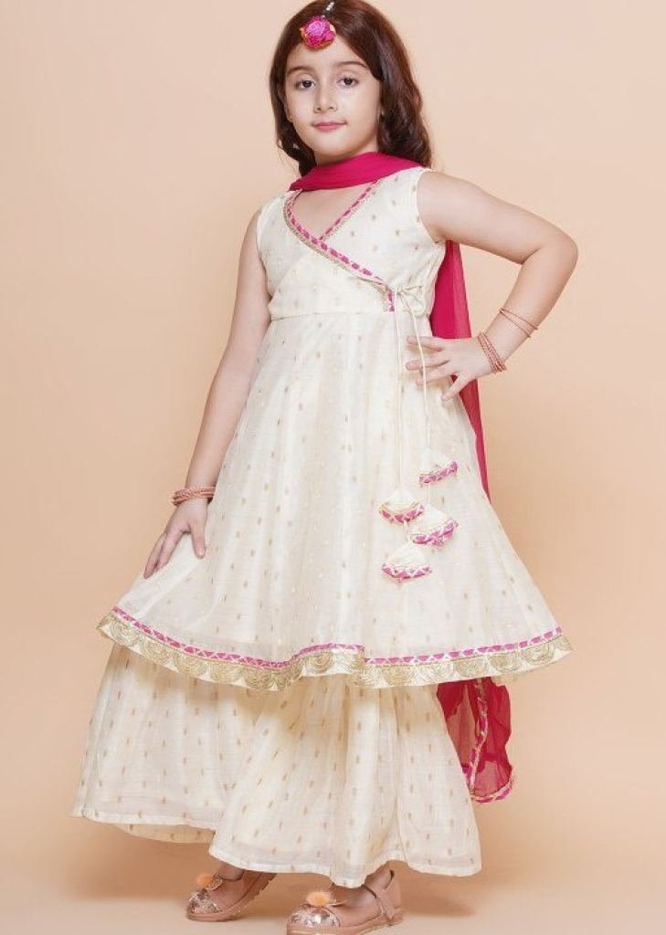 | NAME : | Special New Launch Designer Kids Wear Kurta Sharara With Dupatta Set In Chanderi Silk Fabric White Color DN 168 |