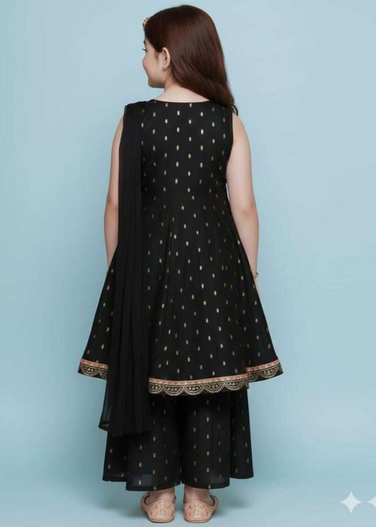 | NAME : | Special New Launch Designer Kids Wear Kurta Sharara With Dupatta Set In Chanderi Silk Fabric Black Color DN 168 |