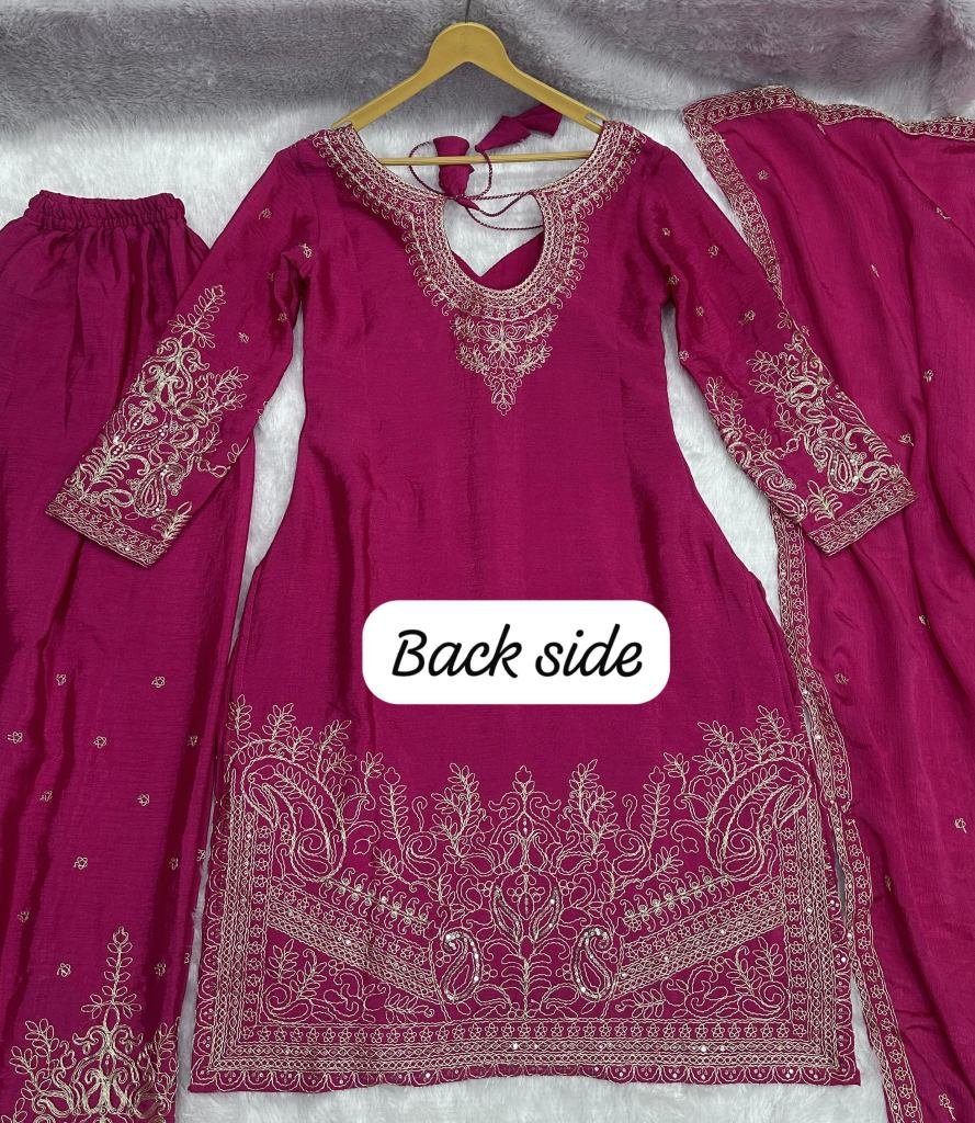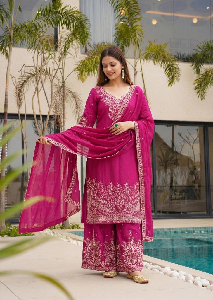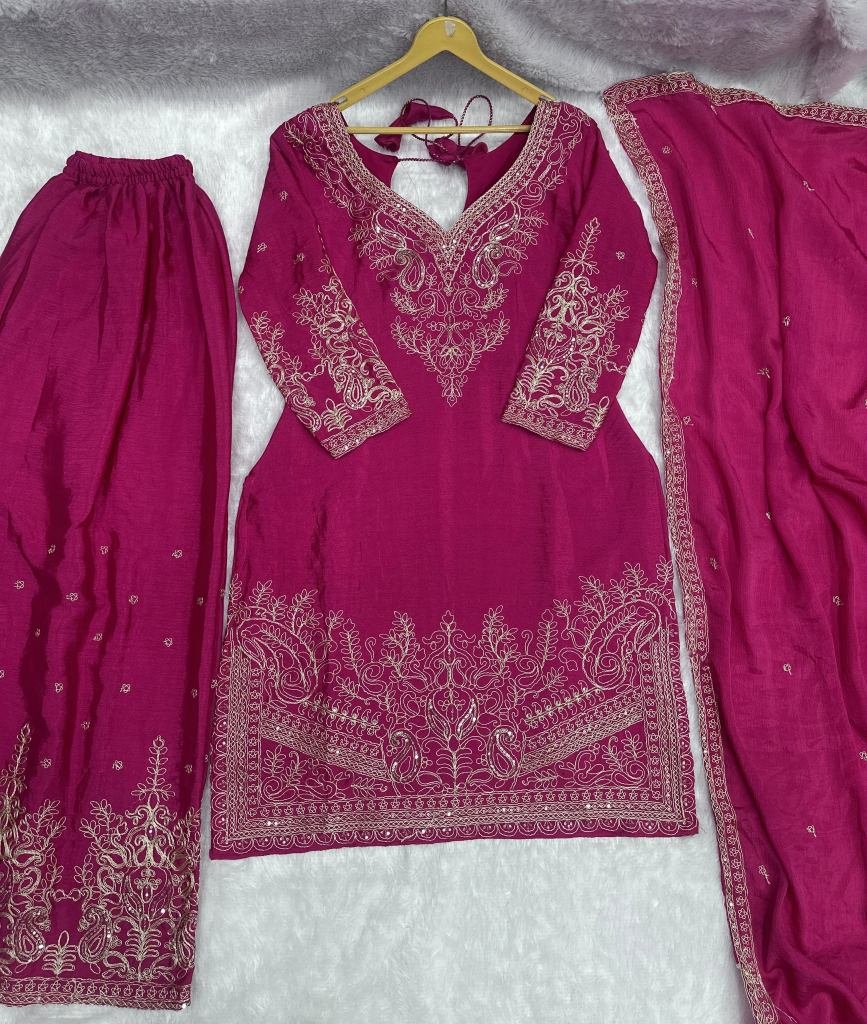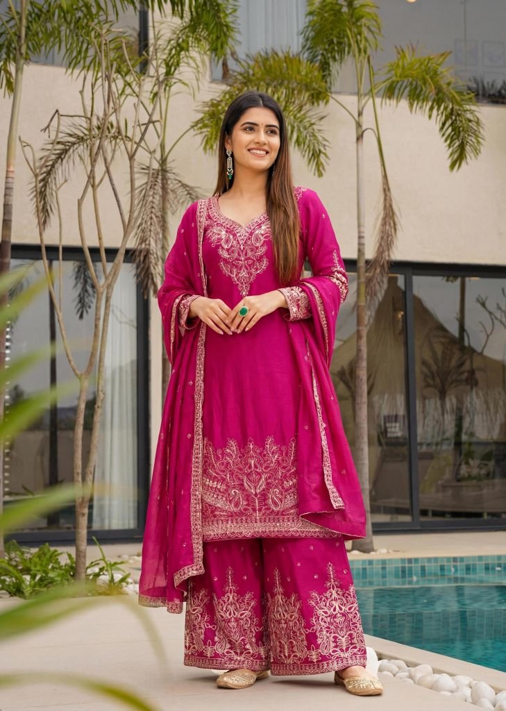 Stylish Designer Palazzo Suit With Embroidery Work And Chinon Silk Kurti Rani Color DN 5155