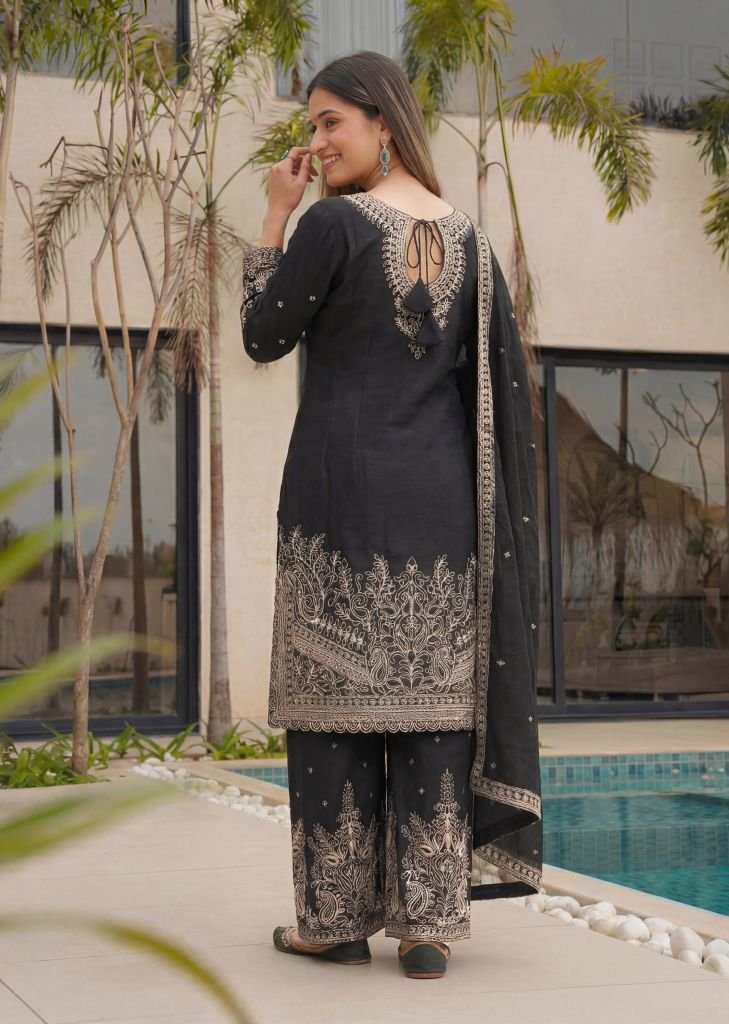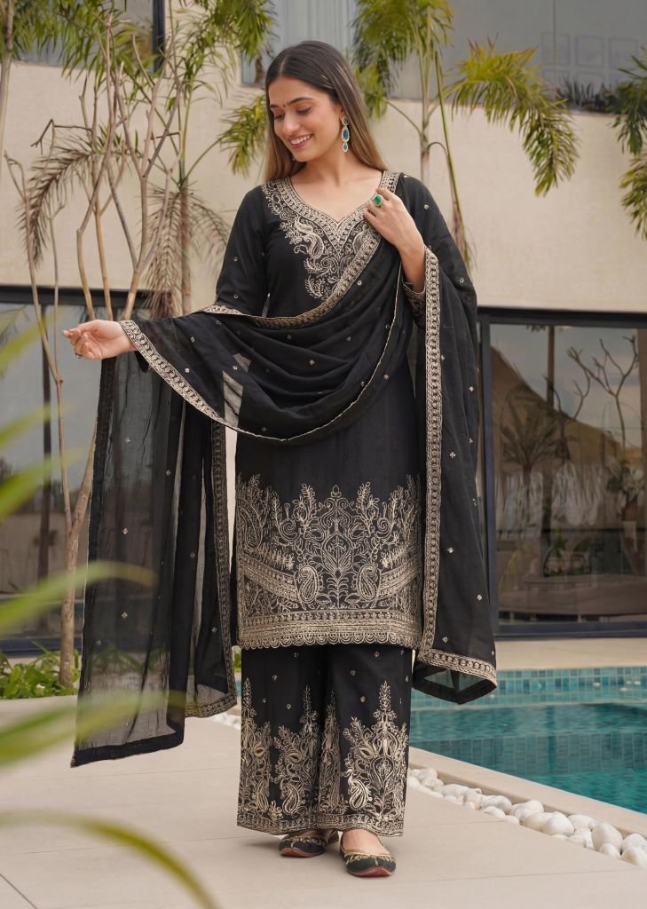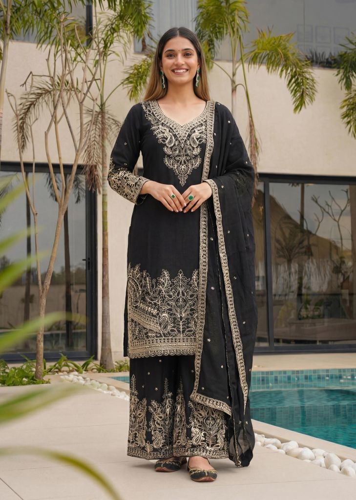 Stylish Designer Palazzo Suit With Embroidery Work And Chinon Silk Kurti Black Color DN 5155