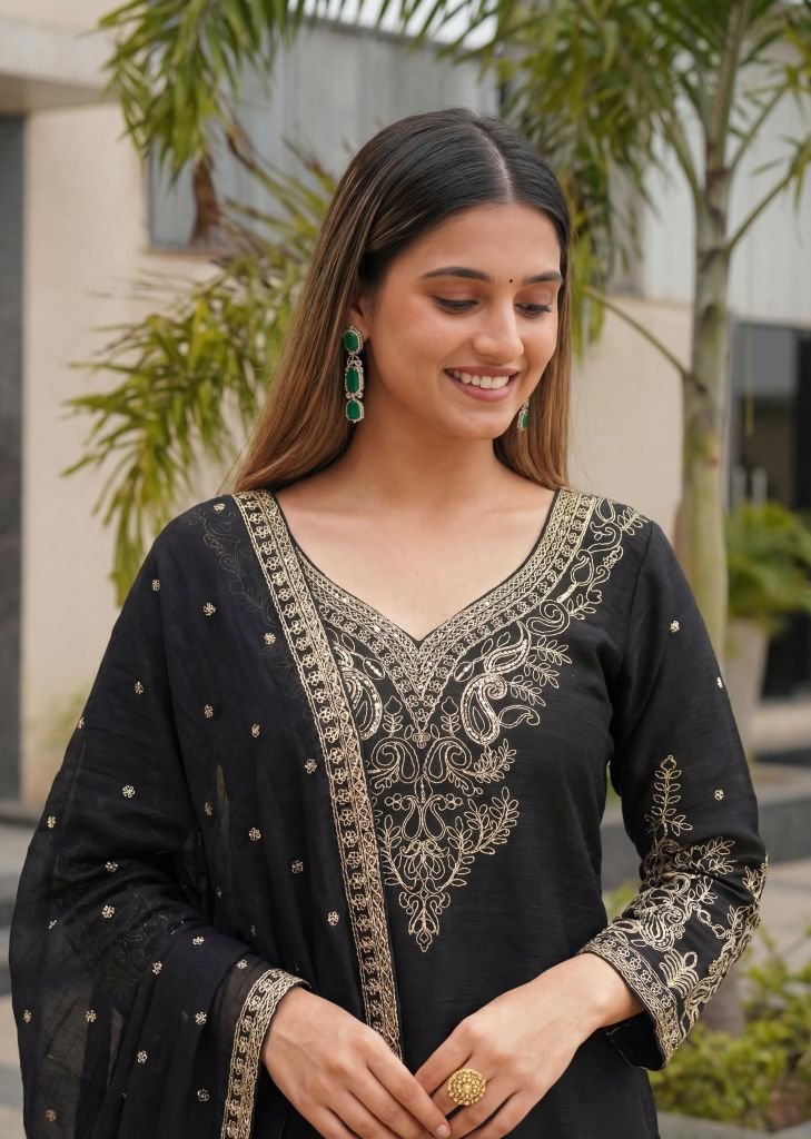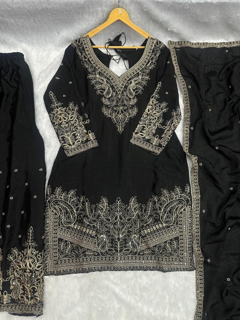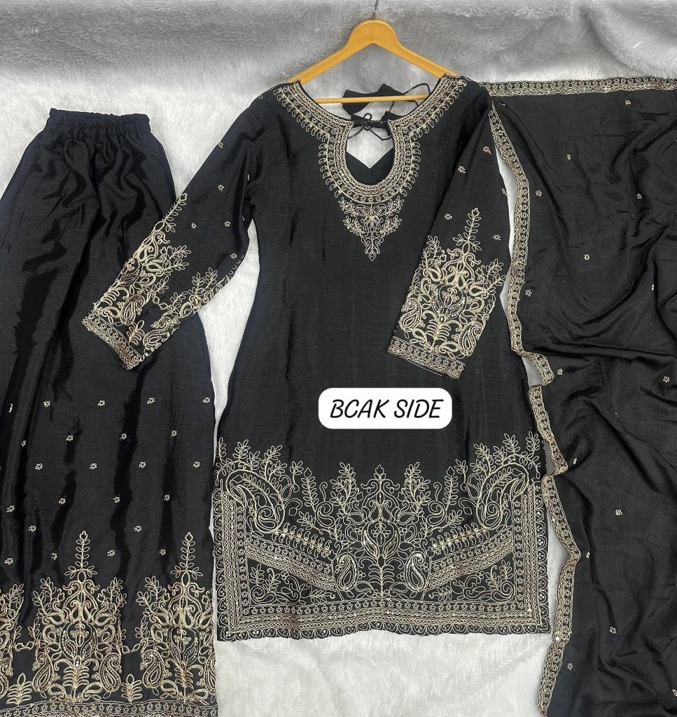| NAME : | Stylish Designer Palazzo Suit With Embroidery Work And Chinon Silk Kurti Black Color DN 5155 |