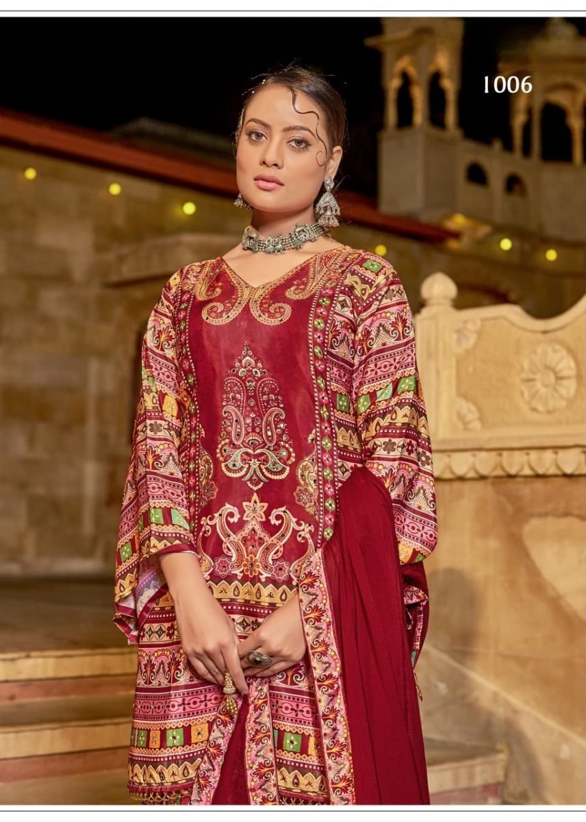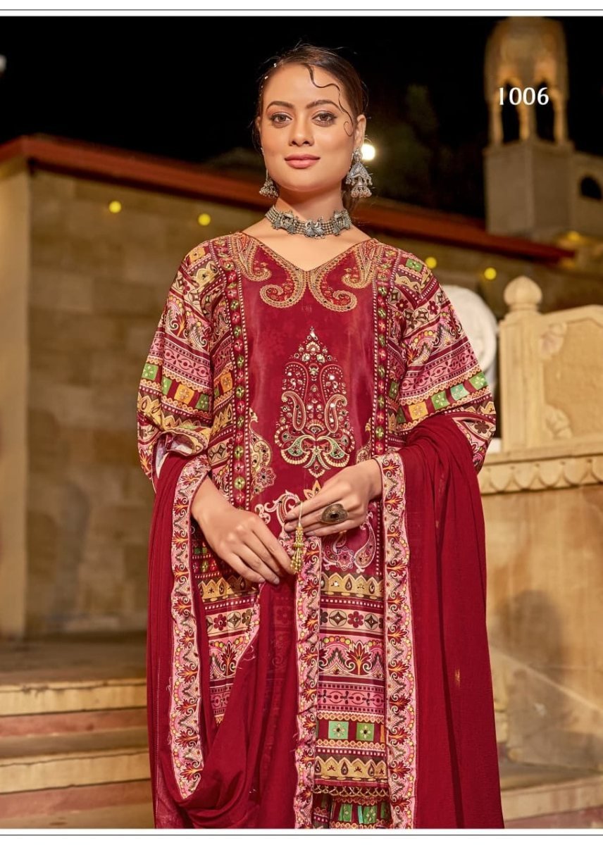| NAME : | Suhani DN 1006 Pure Crepe Silk Digital Print With Original Mirror Work Radymade Pakistani Suit Maroon Color |