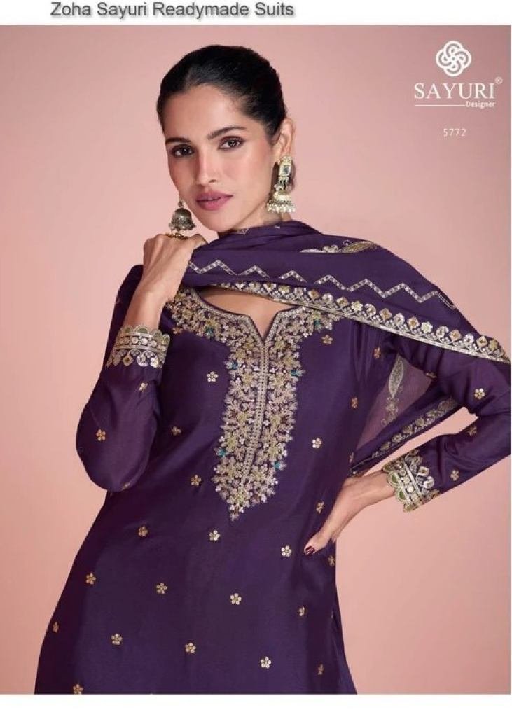 Today presenting Sayuri Designer Zoha Salwar Suit With Embroidery Seqance work Purple Color DN 5772