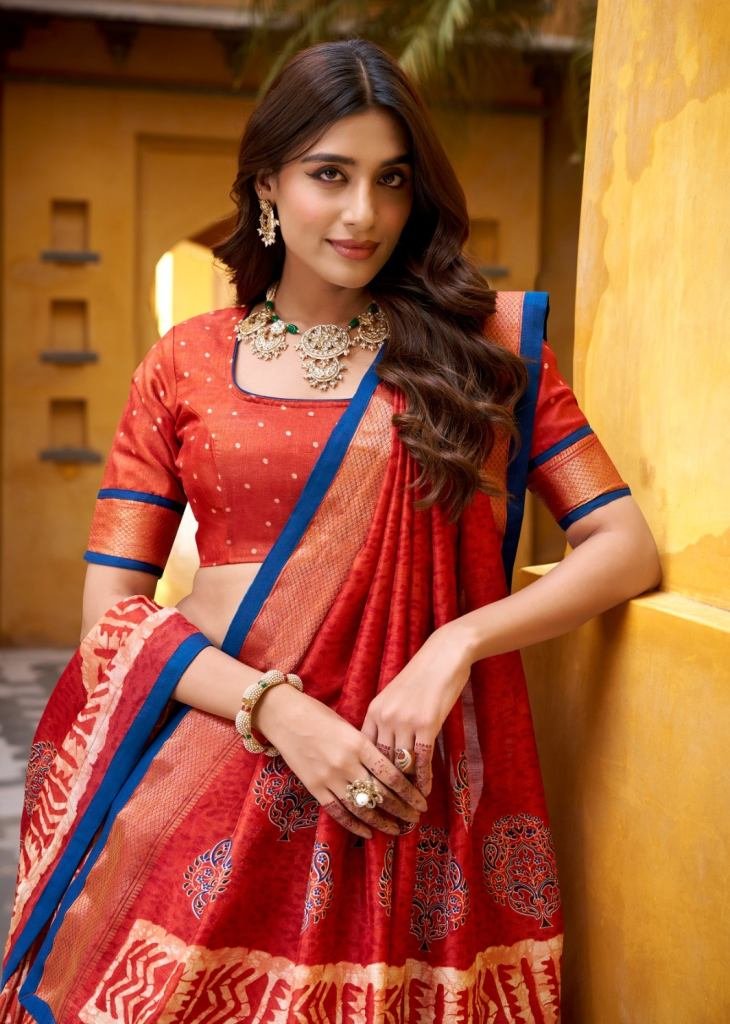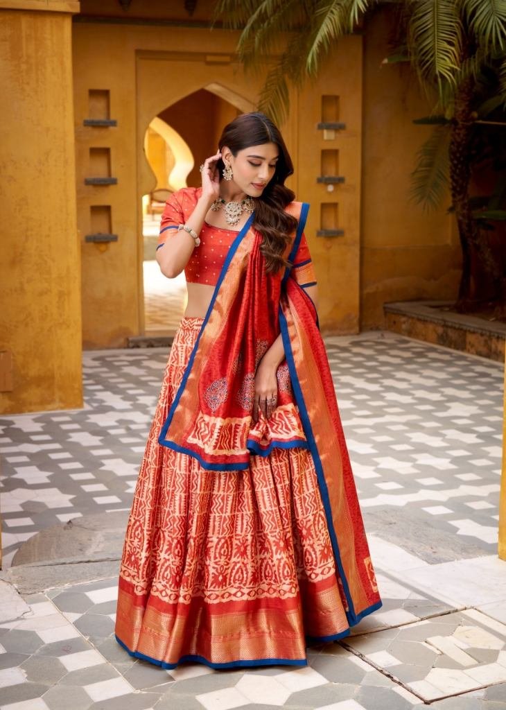 | NAME : | Traditional Elegance In Dola Silk Graceful Batik Art With Zari Weaving Designer Lehenga Choli Orange Color DN 1252 |