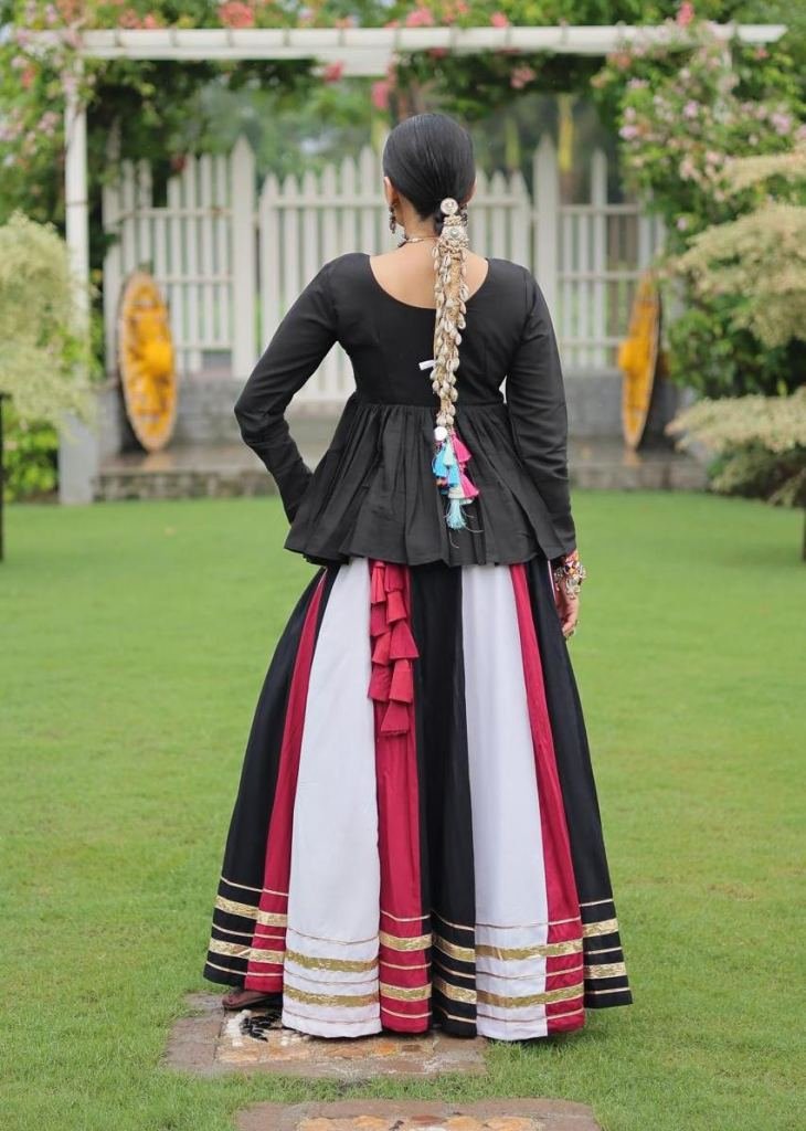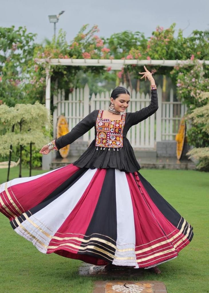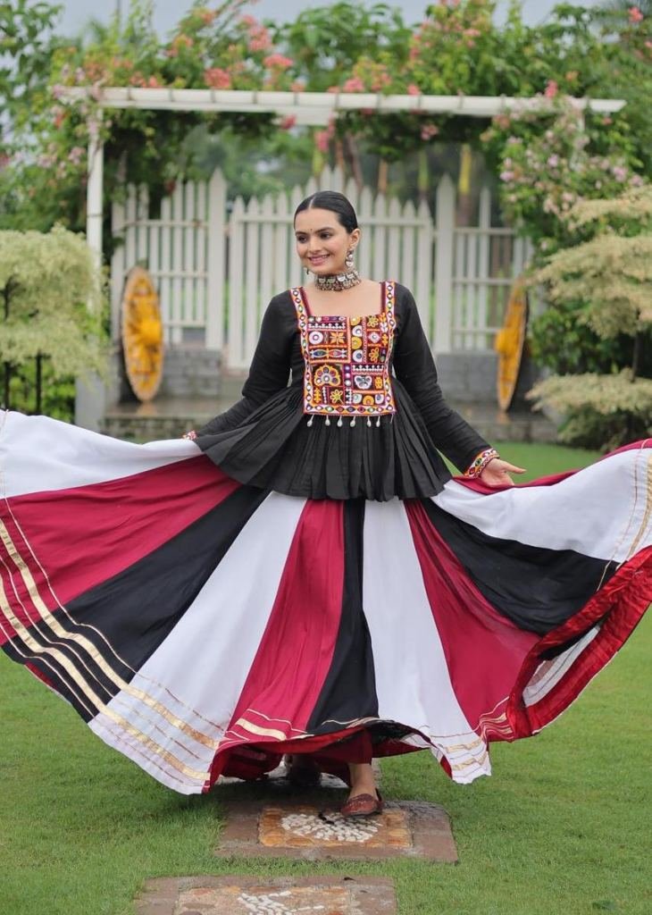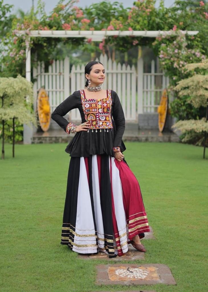 Navratri vibes Are traditional and spiritual, And focus on the fun festive aspects of the festival, So Choose the Multi-colors Lehenga With Black Top For the dancing, the devotion, or the sense of our community.