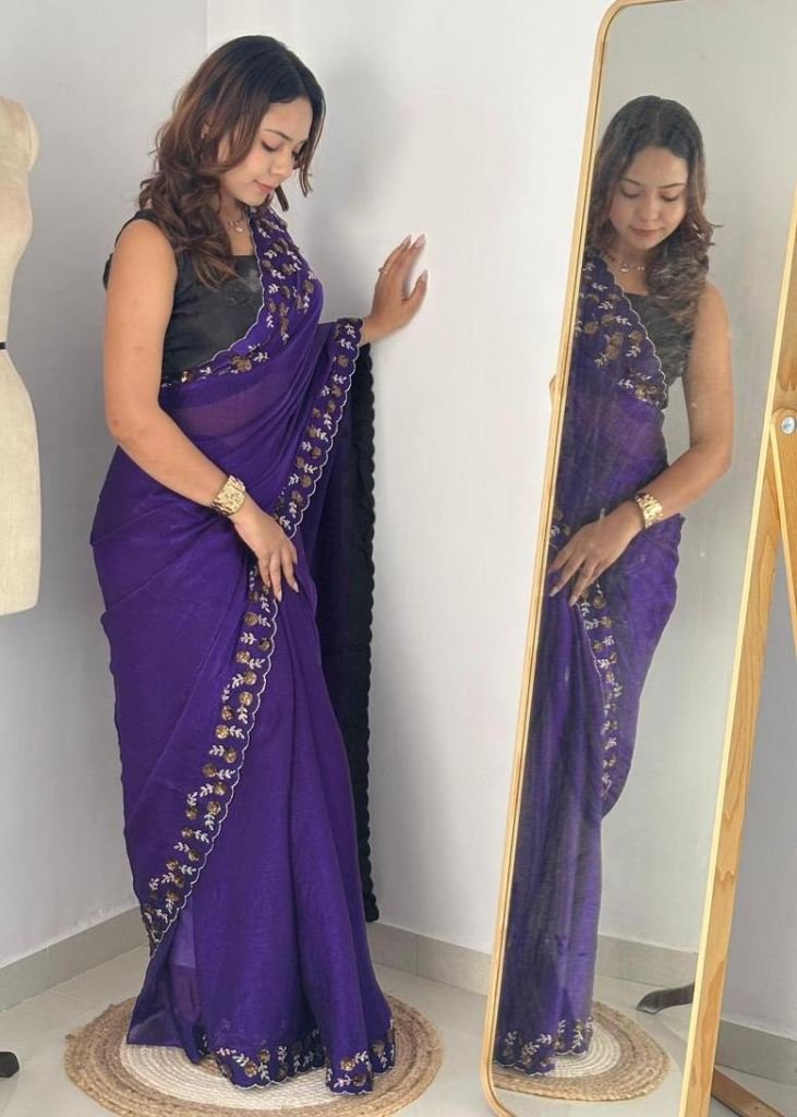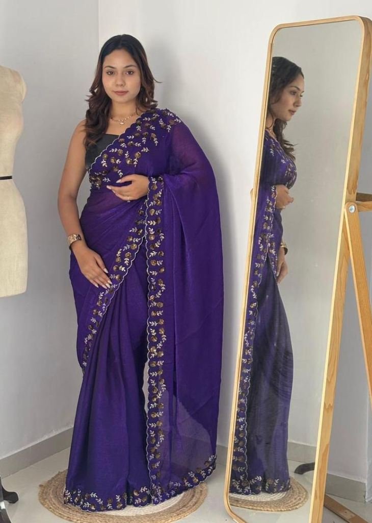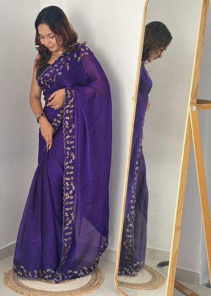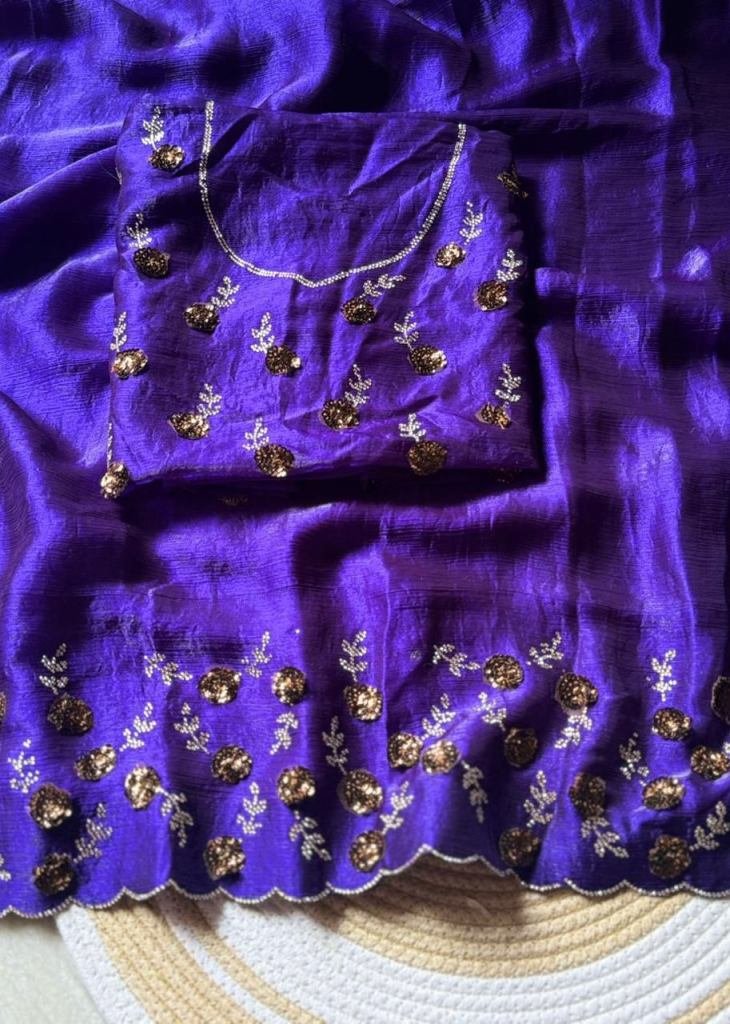 | NAME : | Trending Fendy Chirfforn Fabrics Soft Two Tone Party Wear Handwork With Zarkhand Diamond Work Purple Color Saree |