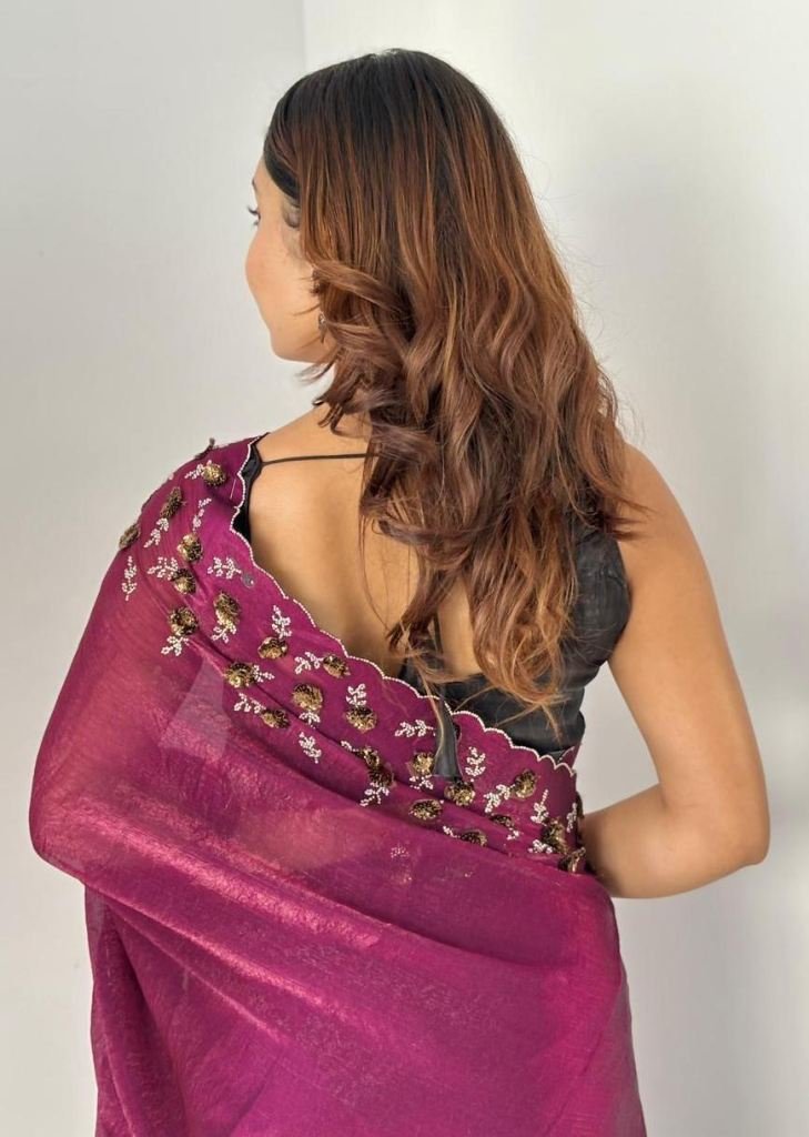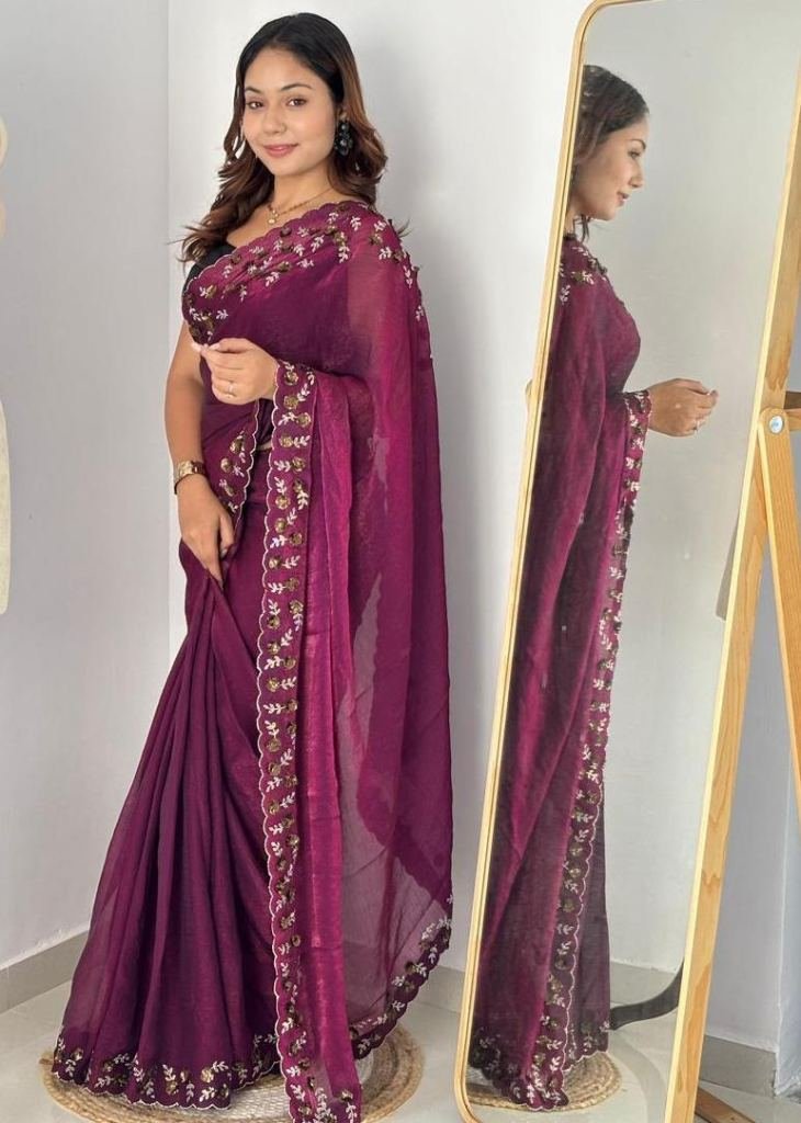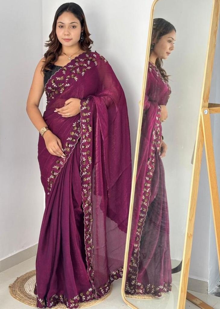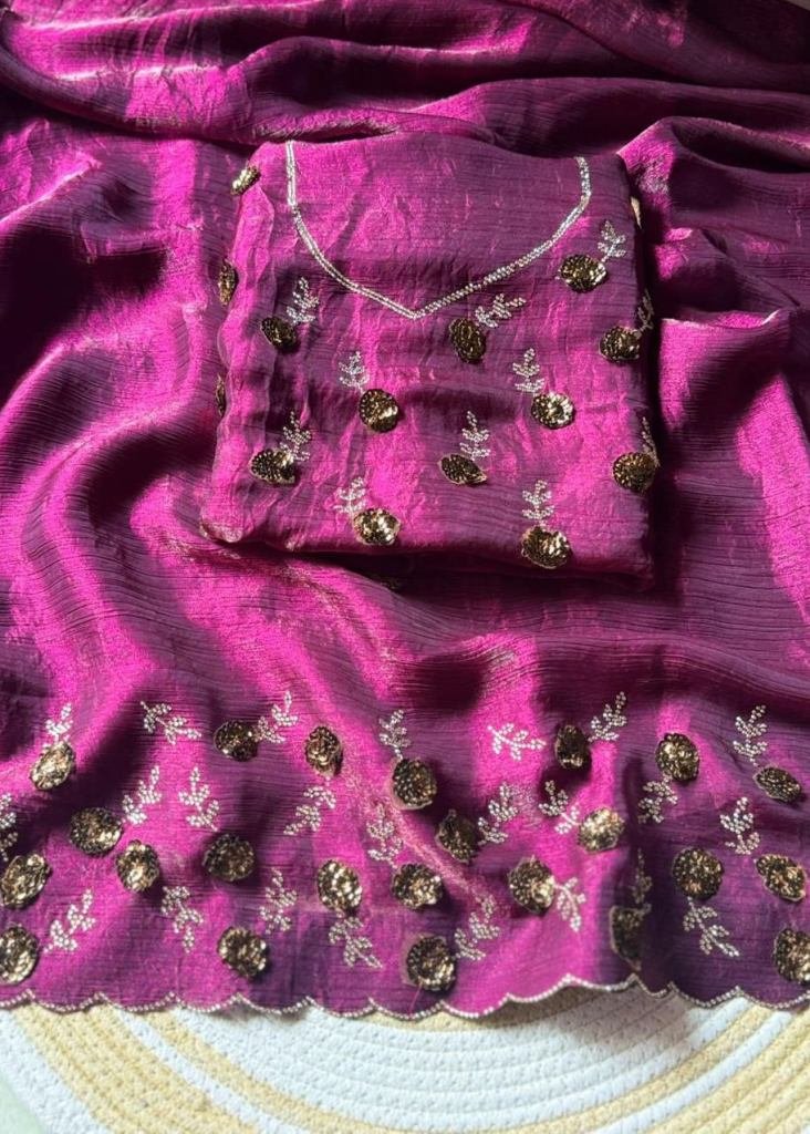 | NAME : | Trending Fendy Chirfforn Fabrics Soft Two Tone Party Wear Handwork With Zarkhand Diamond Work Wine Color Saree |