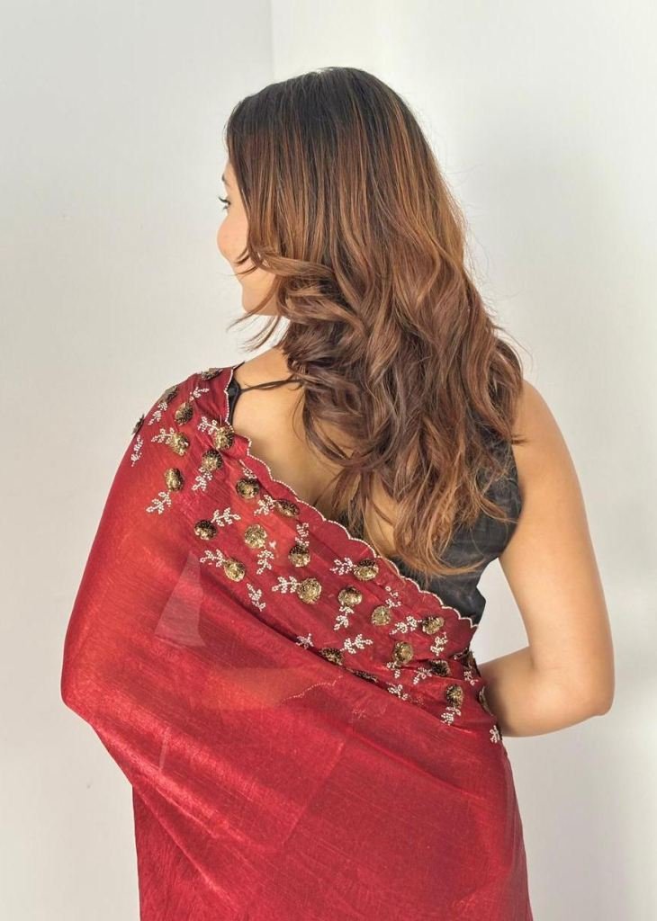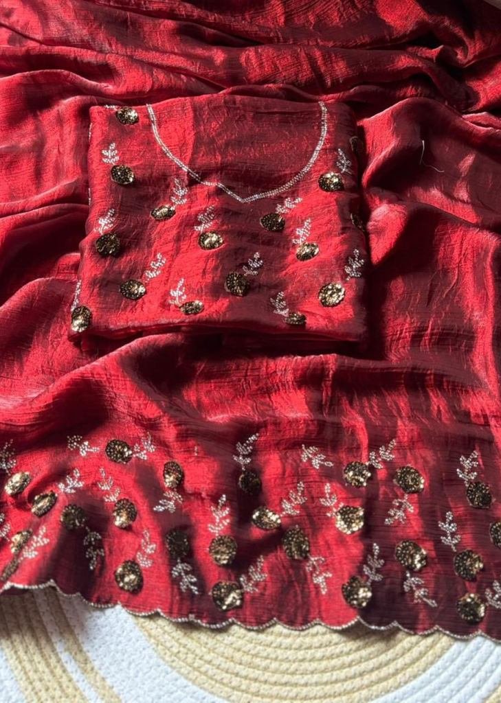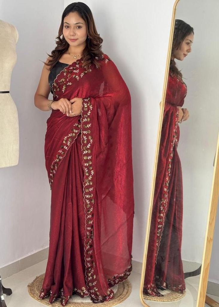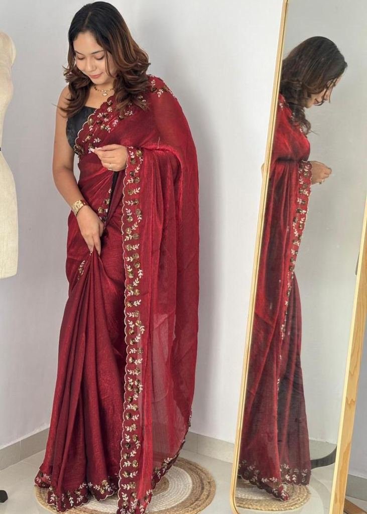 | NAME : | Trending Fendy Chirfforn Fabrics Soft Two Tone Party Wear Handwork With Zarkhand Diamond Work Maroon Color Saree |