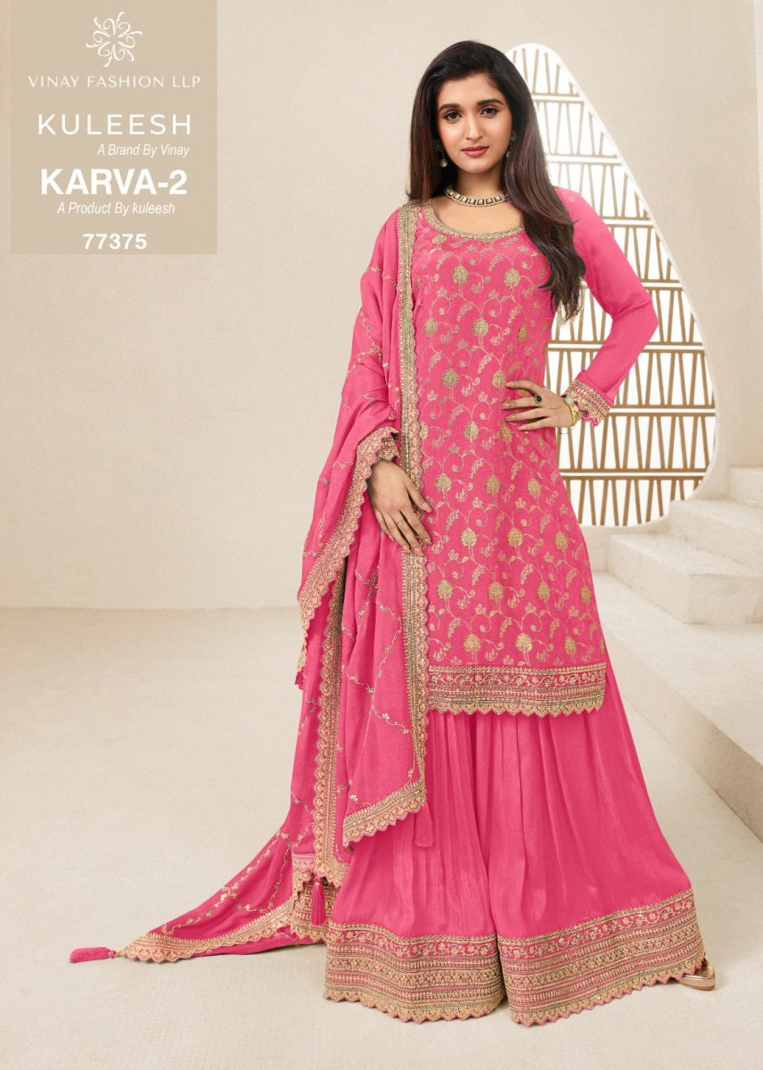 | NAME : | Vinay Kuleesh Karva 2 DN 77375 Chinon Jacquard With Embroidery Work Palazzo Ready Made Suit Dark Pink Color |