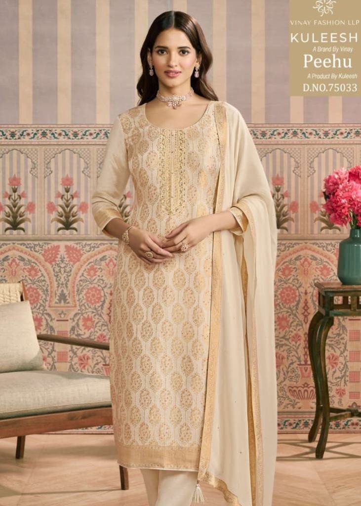 | NAME : | Vinay Kuleesh Peehu Premium Salwar Suit In Heavy Simar Jacquard With Khatli Neck Work Beige Color DN 75033 |