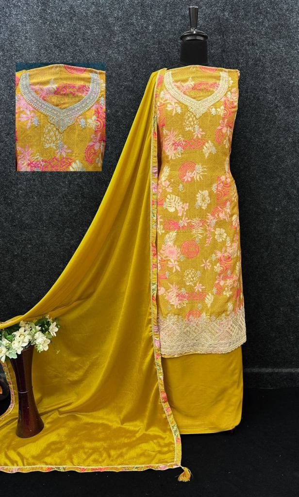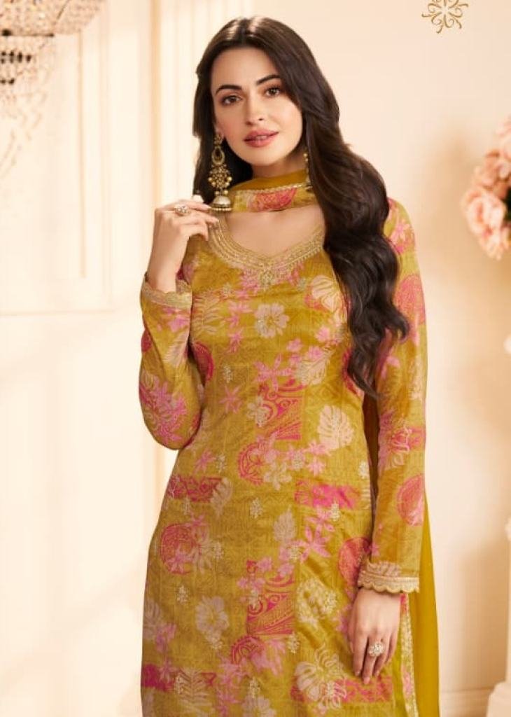 Vinay Kuleesh Roop Designer Salwar Suit In Heavy Chinon With Multi Digital Print And Sequence Embroidery Mustard Yellow DN 75392