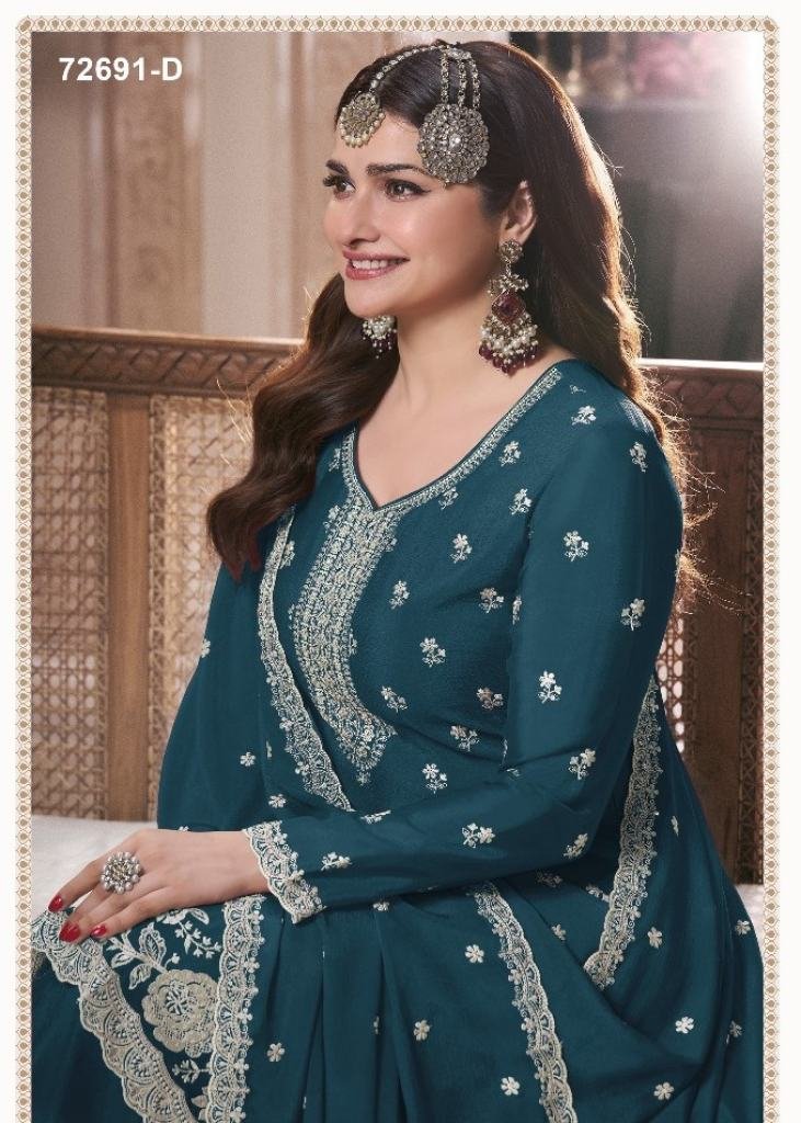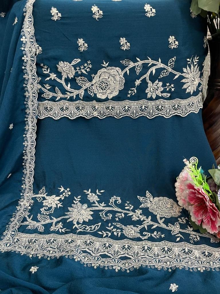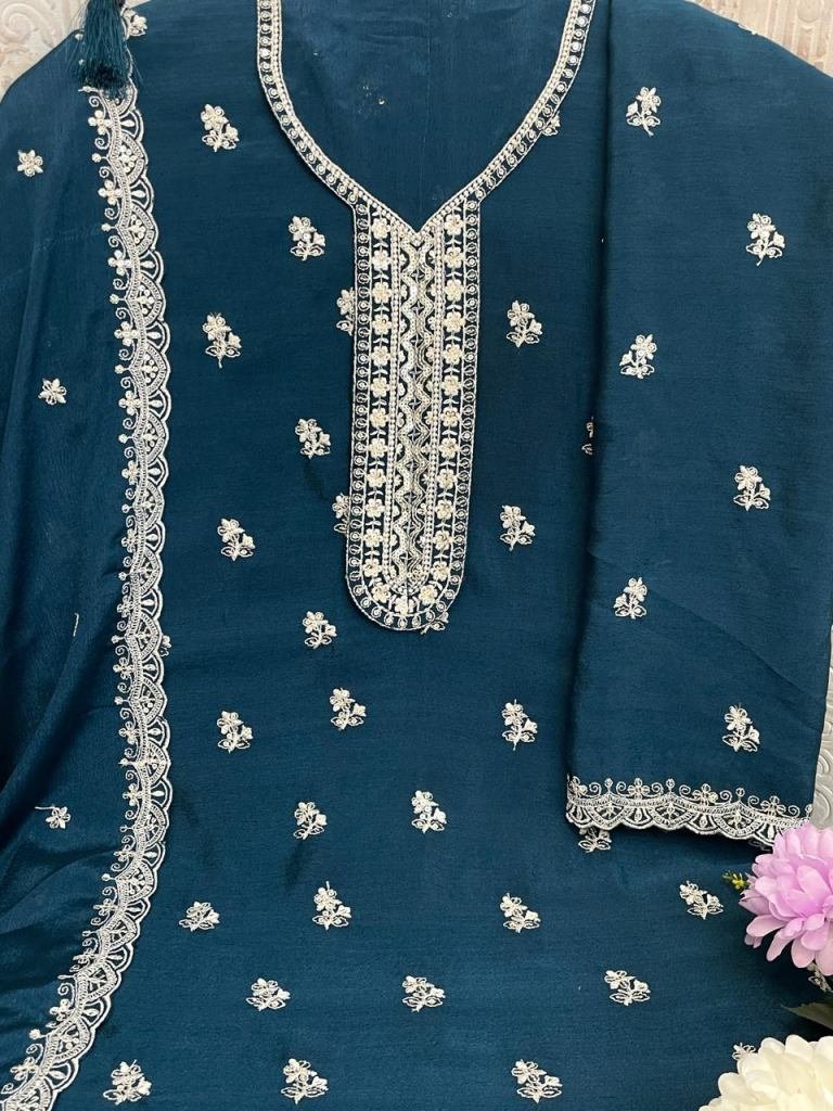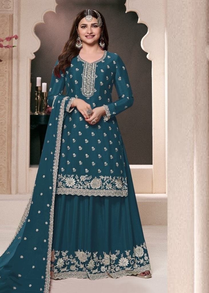 | NAME : | Vinay Kuleesh Saayori Palazzo Suit Semi-Stitched With Embroidered Chinon Fabric Teal Color DN 72691 |
