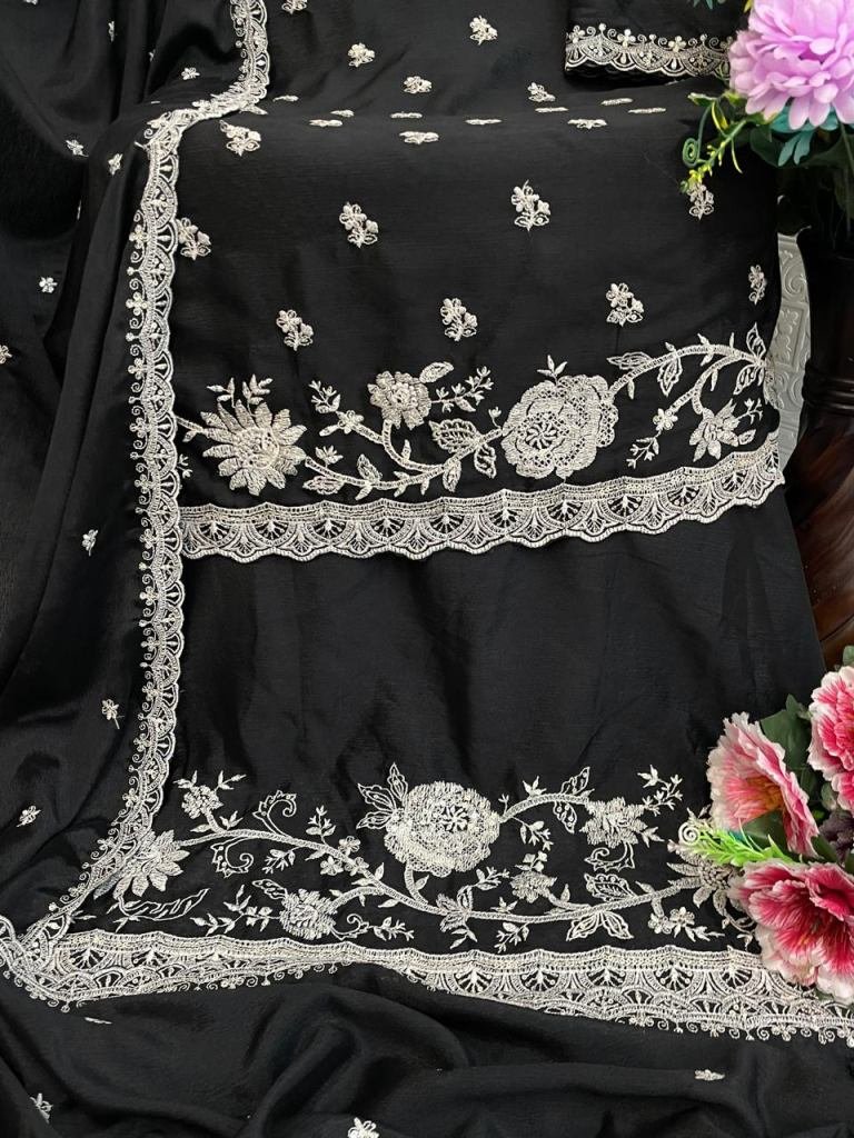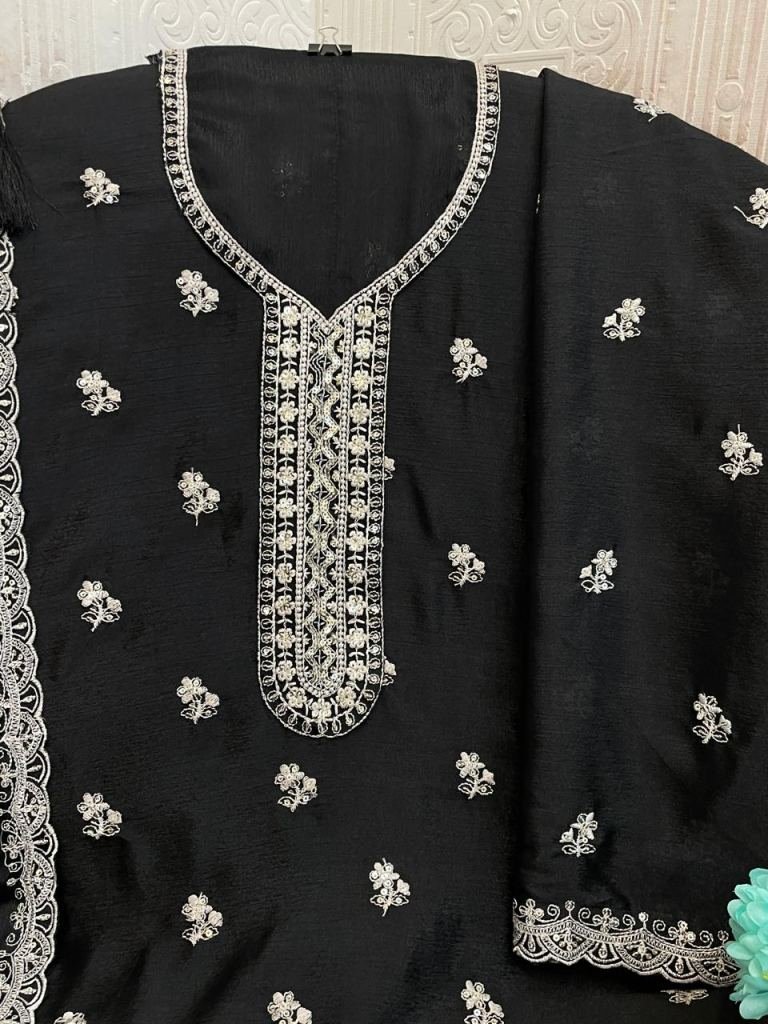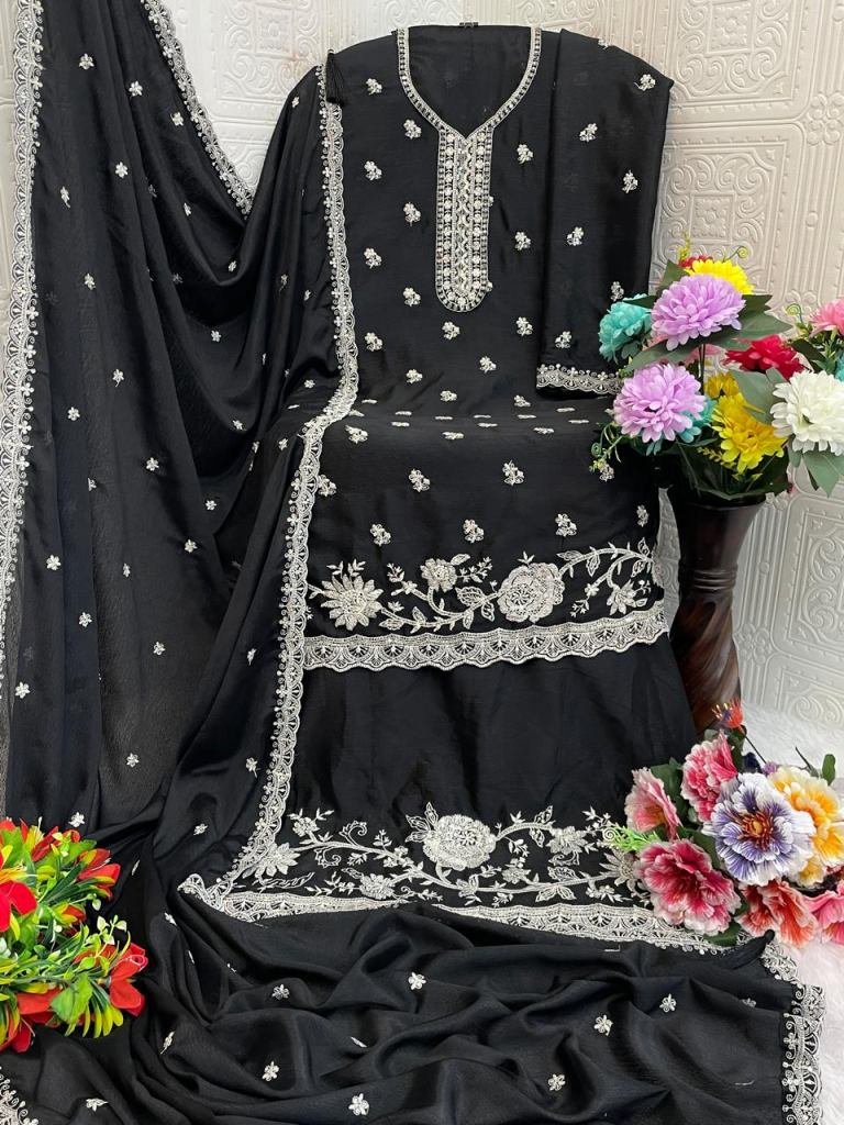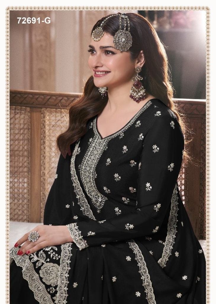 | NAME : | Vinay Kuleesh Saayori Palazzo Suit Semi-Stitched With Embroidered Chinon Fabric Black Color DN 72691 |