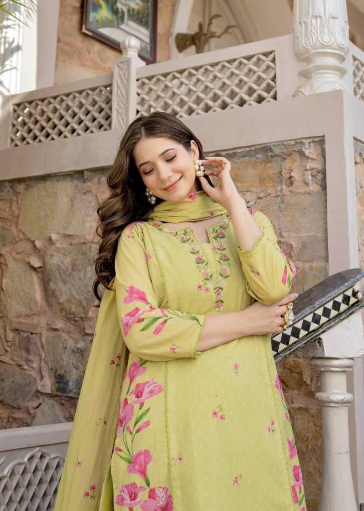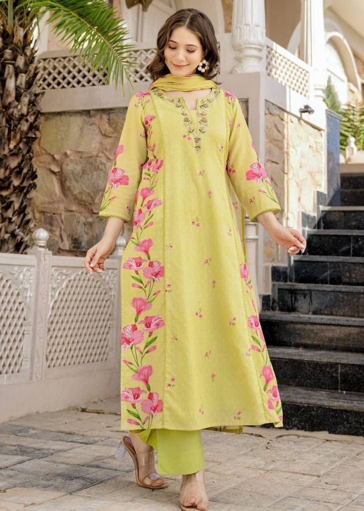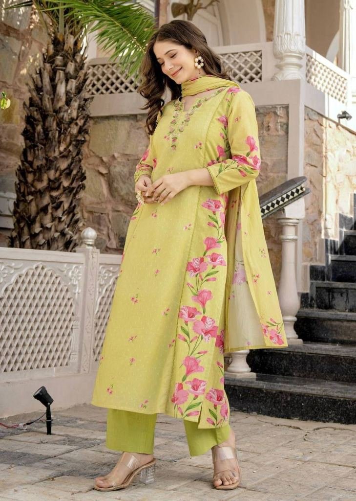 Vrunda Pure Viscose Chanderi Jacquard Butti Heavy Sequence Embroidery Work 3 Piece Kurti Set Yellow Color
